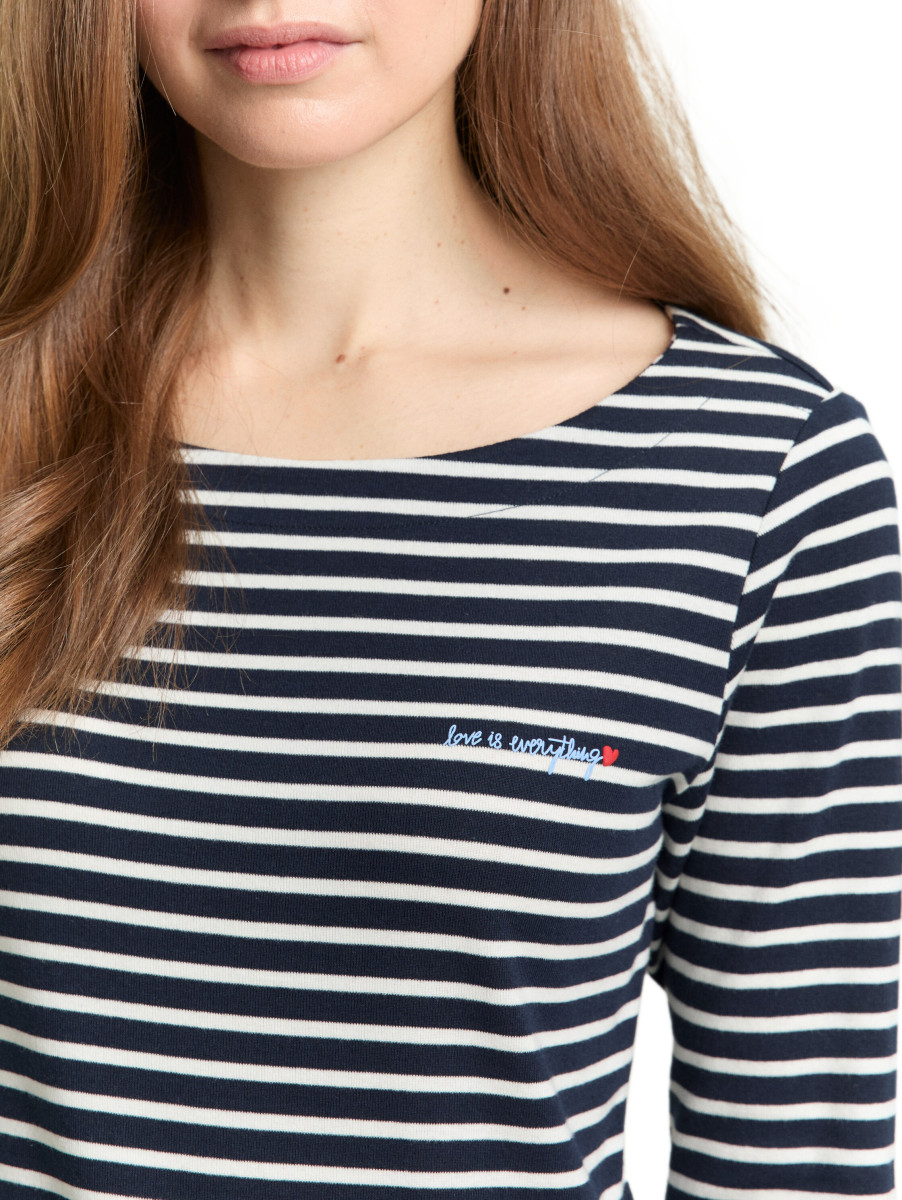 Gestreiftes Longsleeve mit U-Boot-Ausschnitt und 3/4-Arm. Mit femininem Print im Herz-Style auf der Brust. Aus einem Baumwollstoff mit Stretch-Anteil für ein angenehmes Tragegefühl.