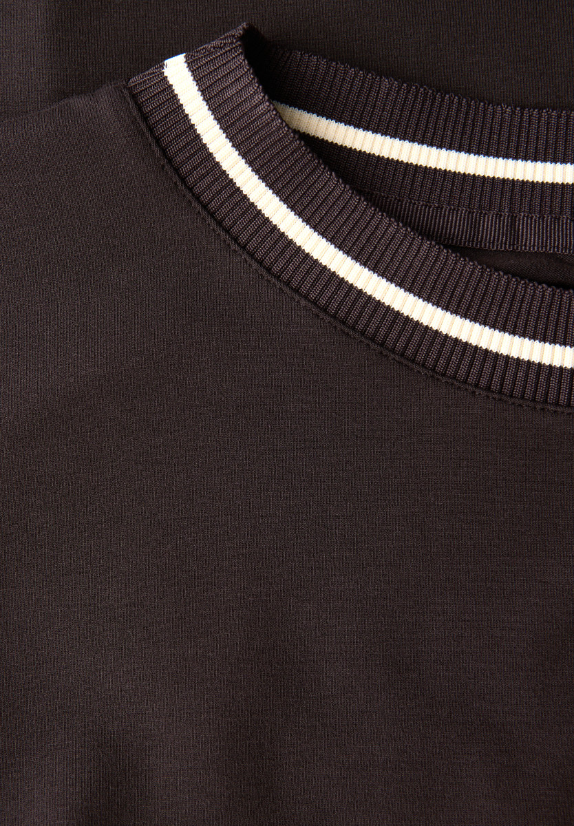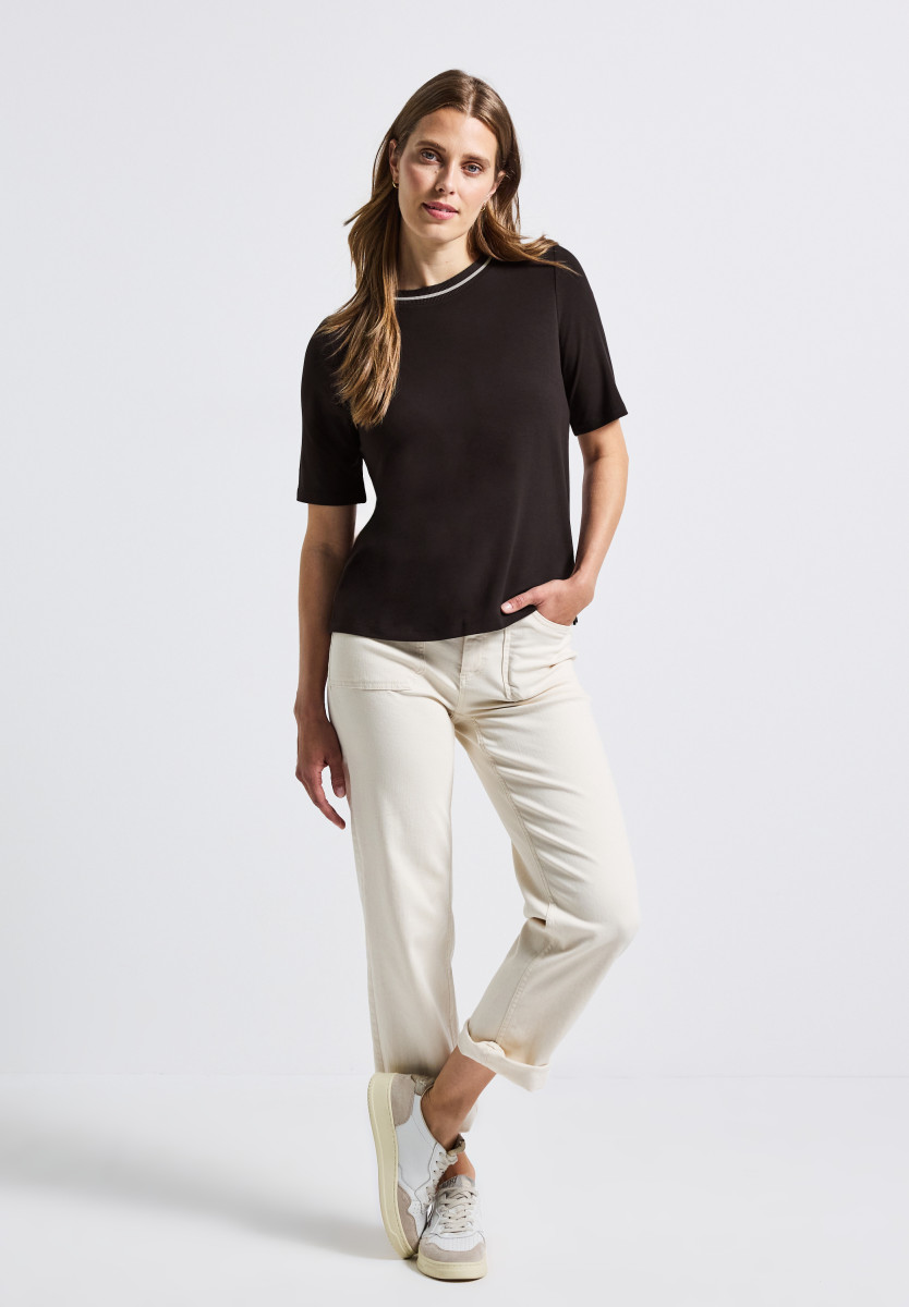 Dieses Shirt mit Rippdetail von Street One für Damen ist ein lässiges Piece für deine Sommergarderobe. Das T-Shirt hat einen Rundhalsausschnitt mit Rippdetail und Kontraststreifen sowie sommerlich kurze Ärmel. Seitliche Schlitze runden den Look ab. Die bequeme Jersey-Qualität aus Viskose mit Stretchanteil verleiht dem Shirt einen hohen Tragekomfort.