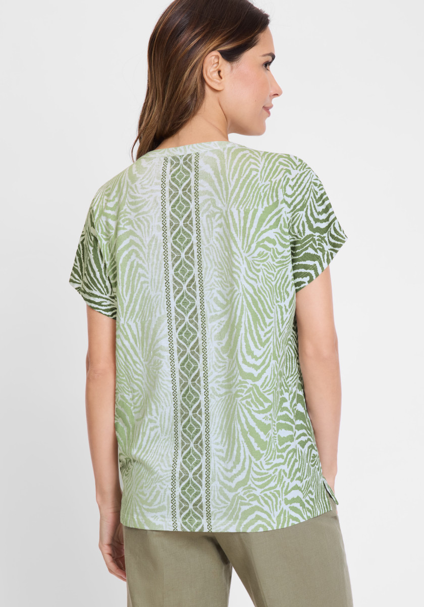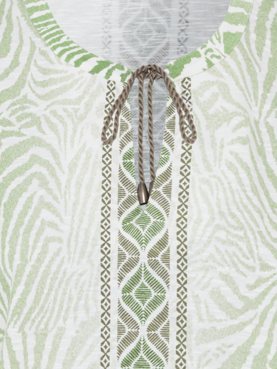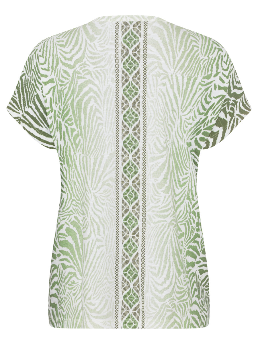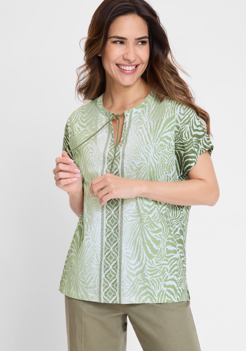 Dieses T-Shirt begeistert mit seinem lockeren Schnitt und einem stilvollen Allover-Print. Die weite Olsen-Passform „Cosima“ sorgt für ein angenehmes Tragegefühl, während der geschlitzte Rundhalsausschnitt mit verspielten Bindebändern feminine Akzente setzt. Ein lässiger Begleiter aus weicher Baumwolle. Länge: 62 cm.