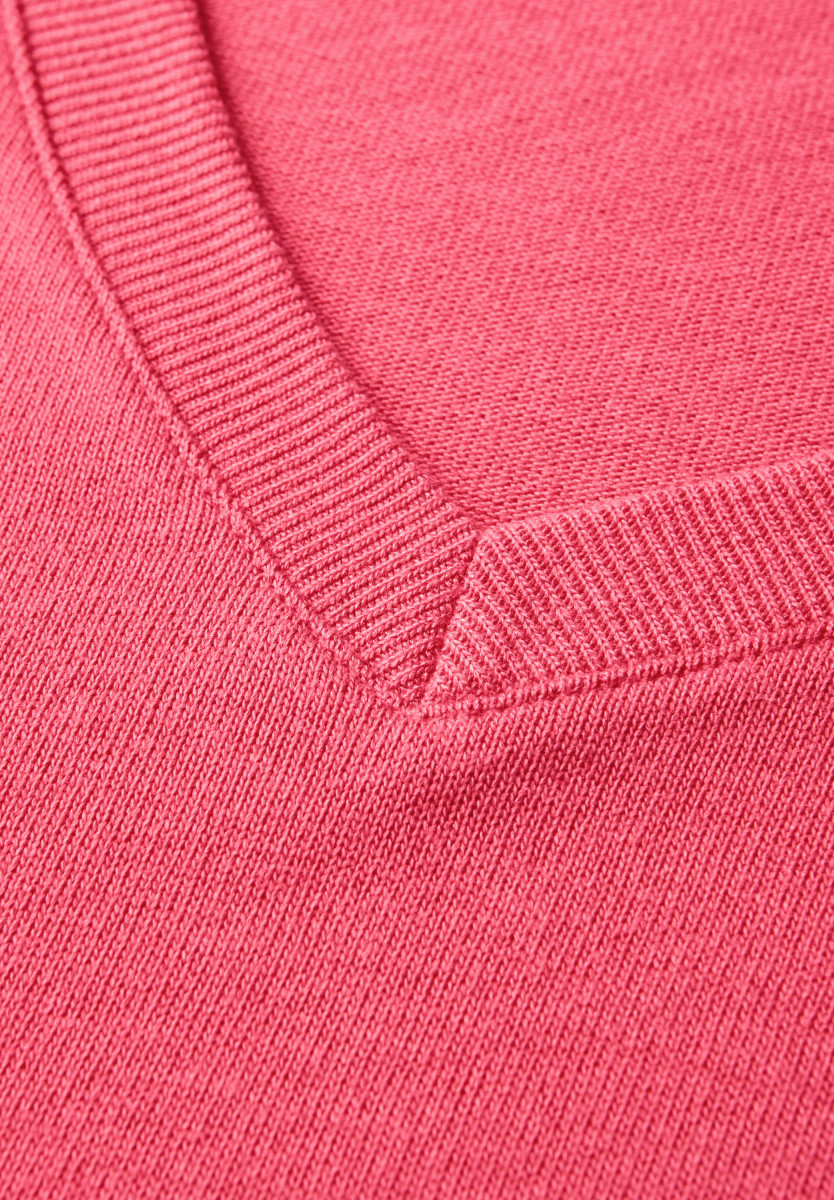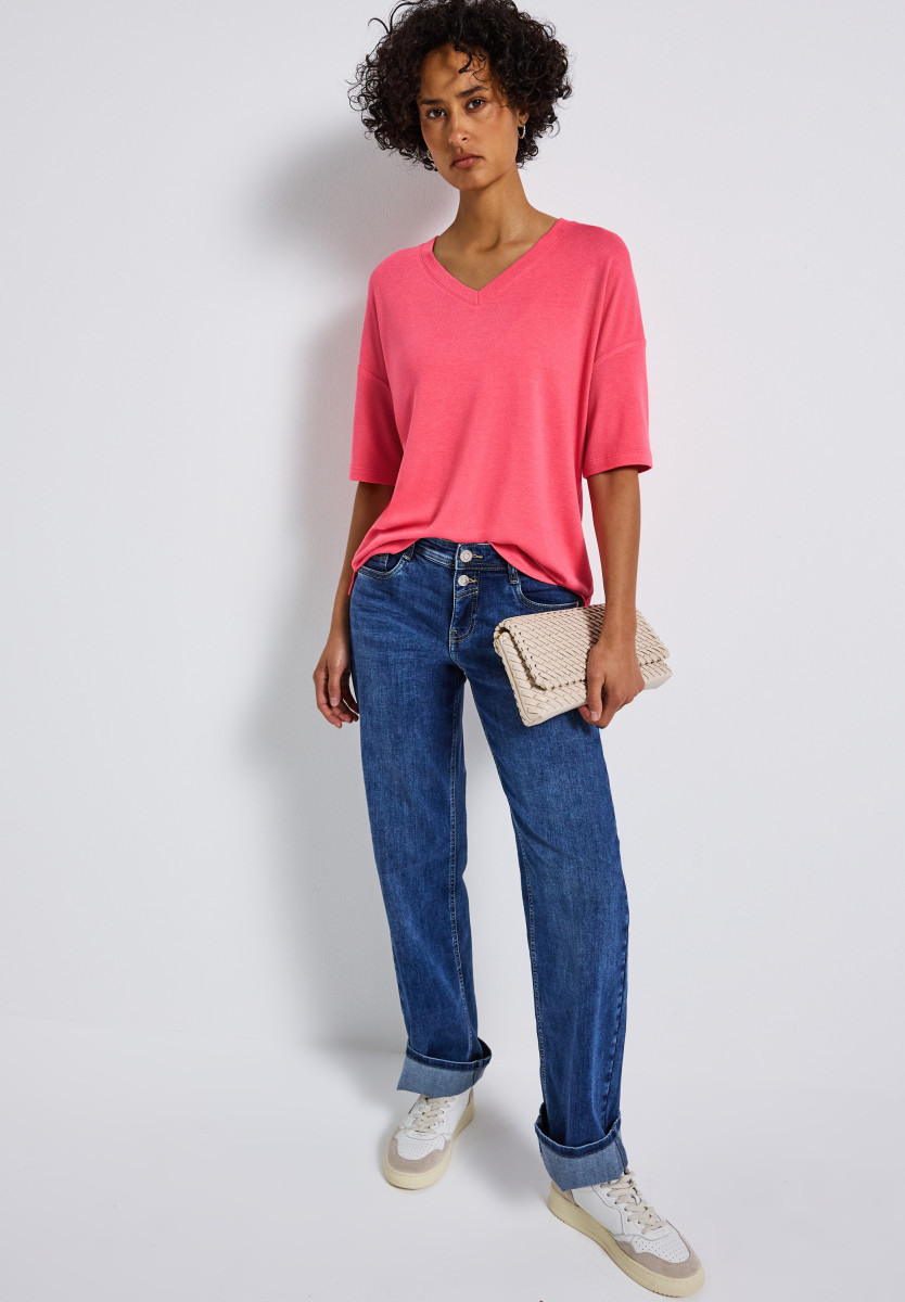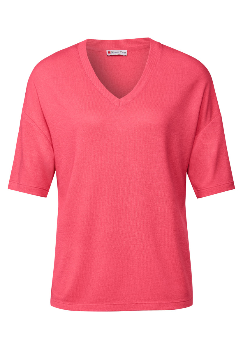 Das Sommershirt von Street One für Damen setzt auf einen modischen V-Ausschnitt und dezente seitliche Schlitze für eine legere Silhouette. Der Strick-Look verleiht dem T-Shirt eine besondere Note, während die weiche Qualität mit hohem Tragekomfort überzeugt. Ideal für feminine Casual-Outfits an warmen Tagen. Sommershirt V-Ausschnitt Kurzarm Seitliche Schlitze Angenehmer Tragekomfort