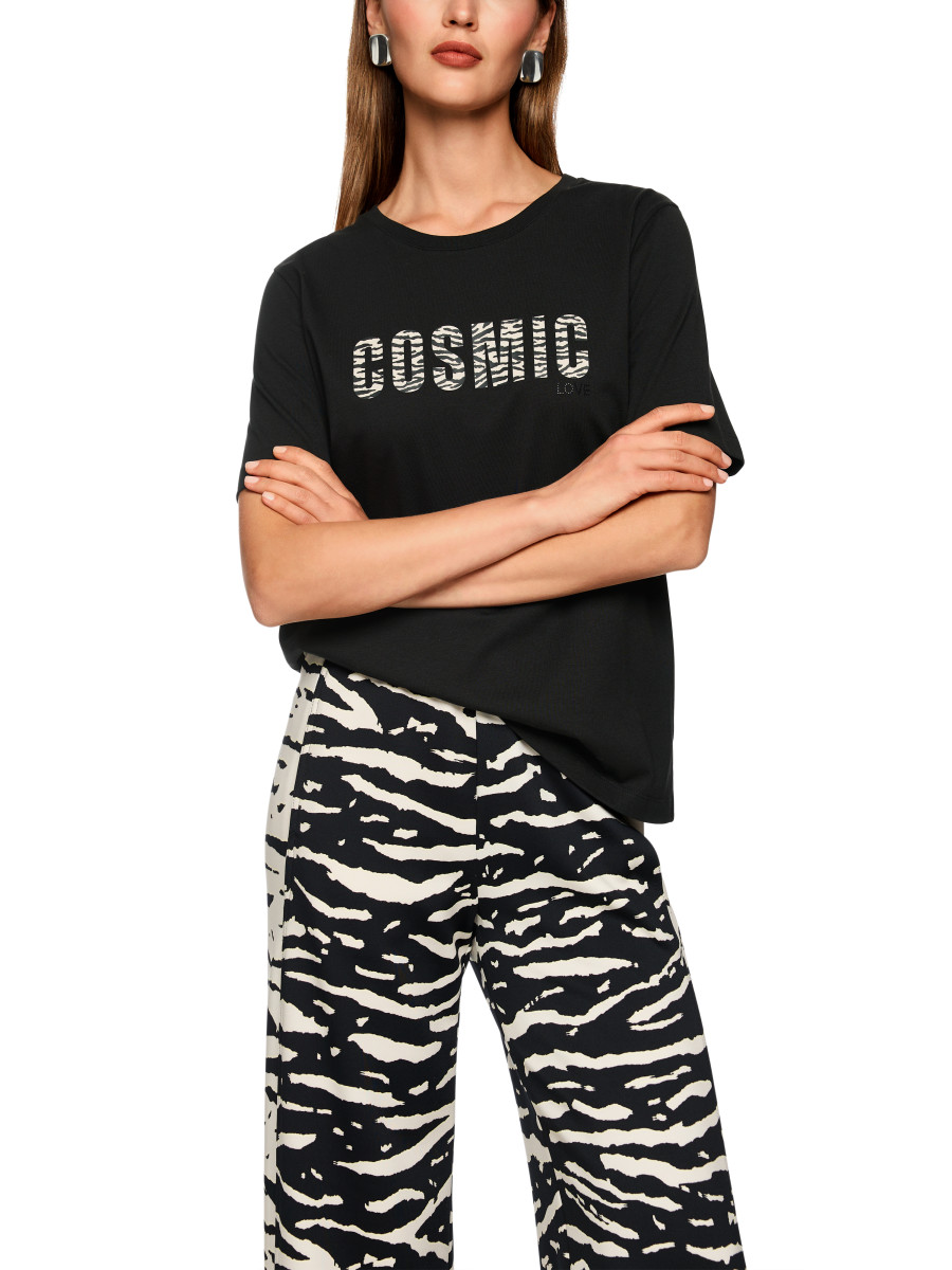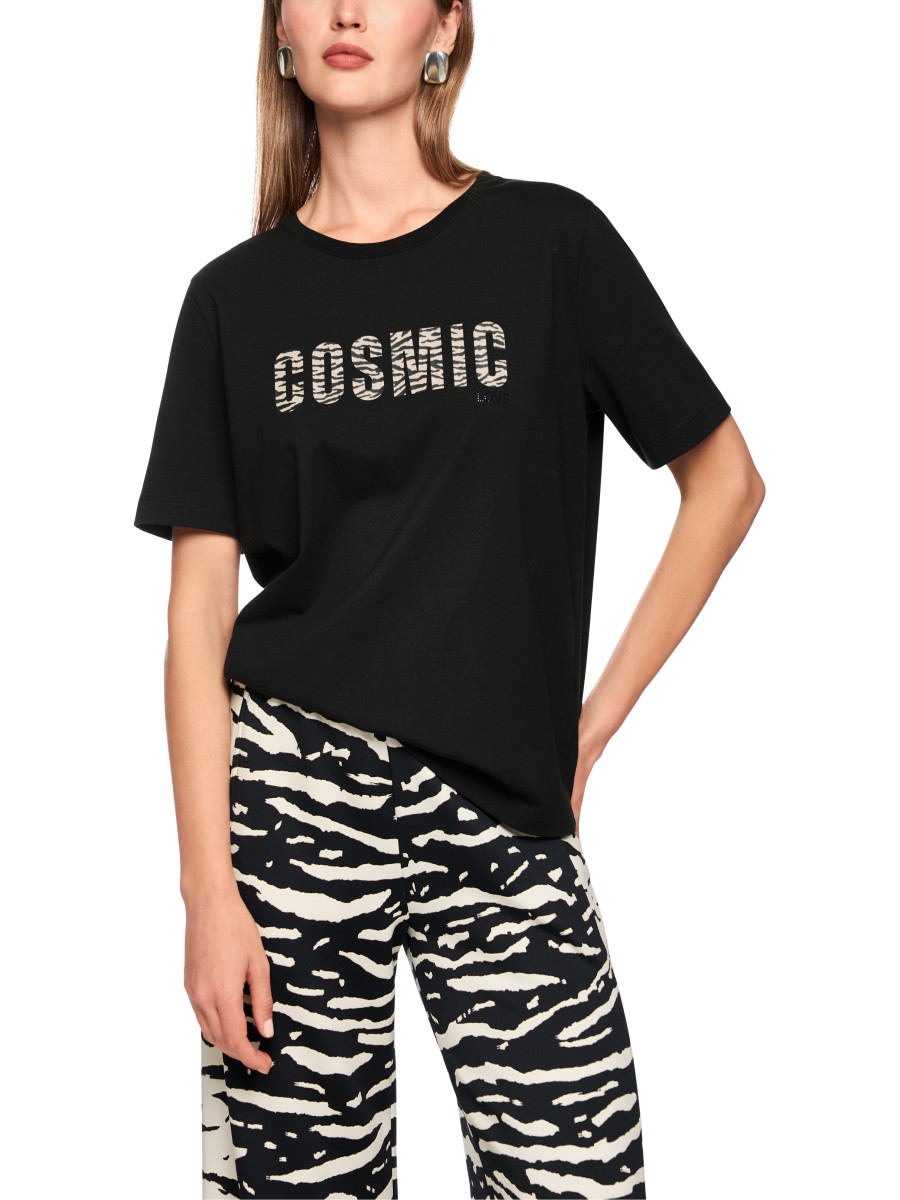 Lässiges T-Shirt mit modernem Aufdruck. Das Modell ist weitgehend klassisch geschnitten und besitzt einen Rundhals Ausschnitt und kurze Ärmel. Eyecatcher ist der Animal-Print mit dem Slogan 'Cosmic Love'.