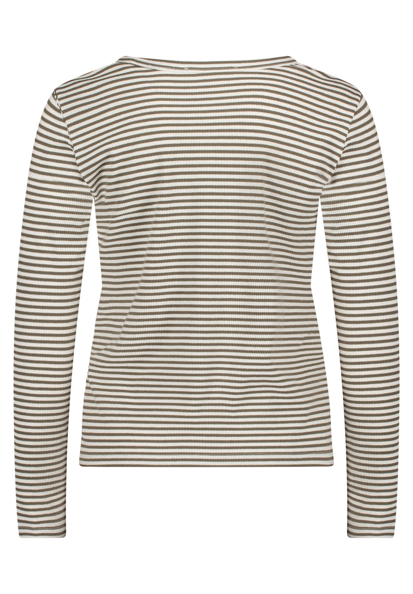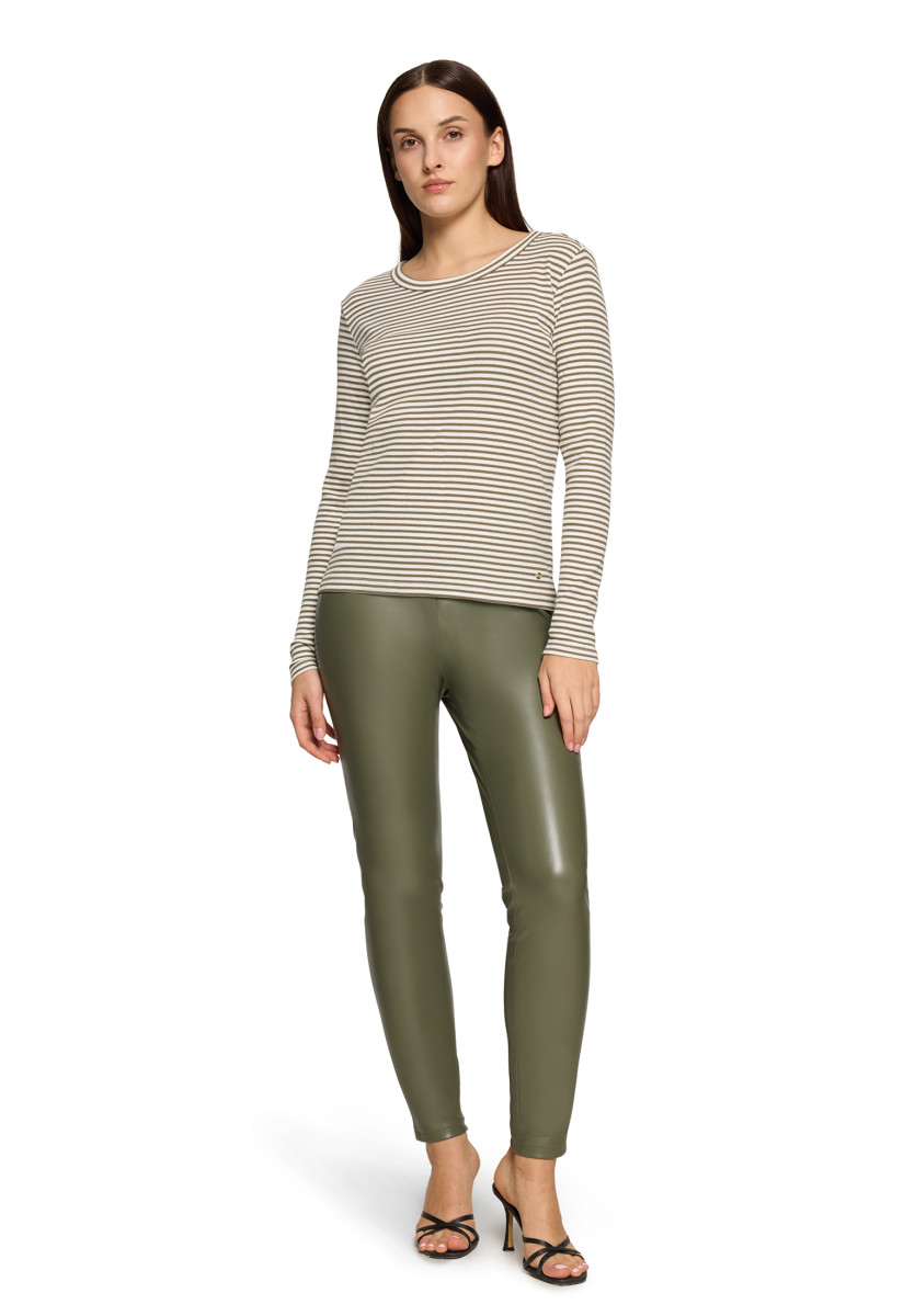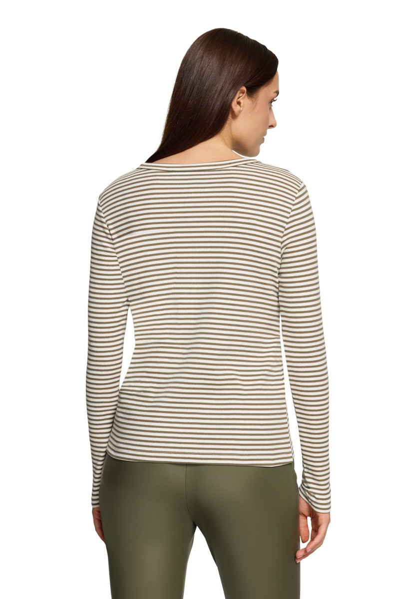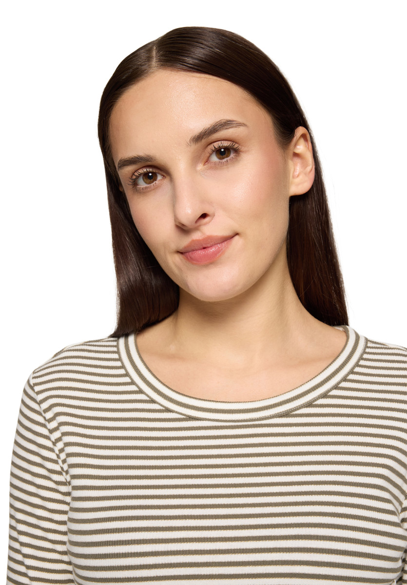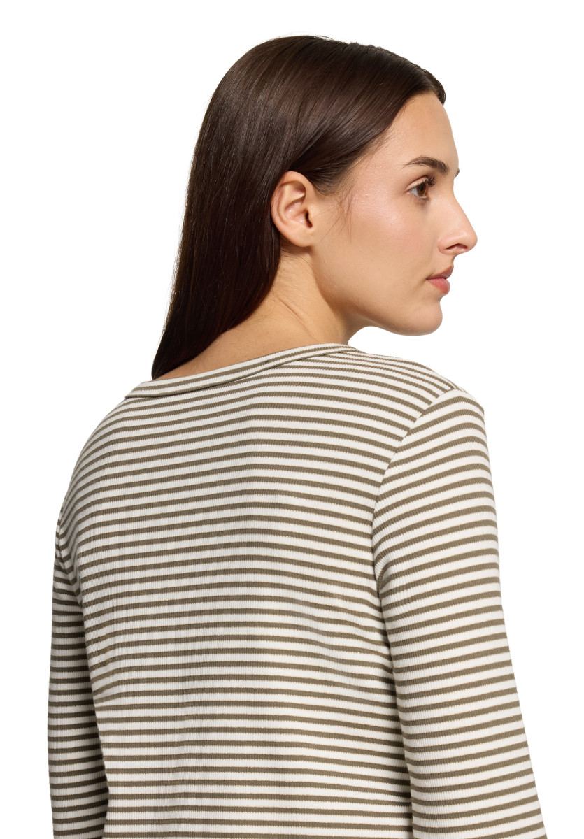 Das leicht taillierte T-Shirt bietet eine feminine Silhouette und angenehmen Tragekomfort. Mit einer Gesamtlänge von 62 cm und langen Ärmeln sowie einem klassischen Rundhalsausschnitt ist es vielseitig kombinierbar. Das gestreifte Design verleiht dem Shirt eine zeitlose Optik, die sich gut zu Jeans oder eleganteren Looks kombinieren lässt.Lief.-Art-Nr: 23823114