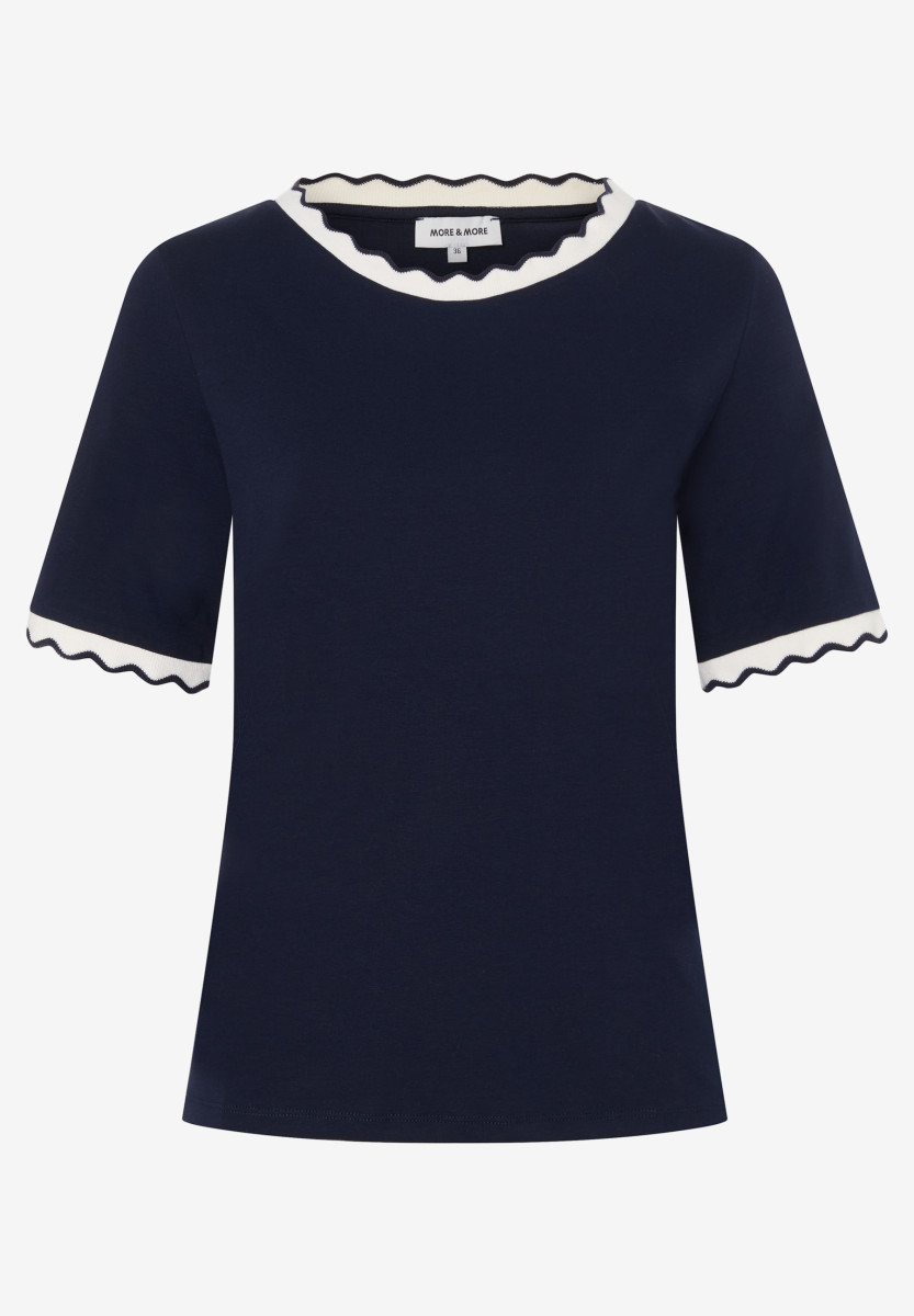 Dieses Damen T-Shirt besticht durch einen femininen Schnitt und eine dezente Wellenkante als kleines Designdetail. Es lässt sich vielseitig kombinieren und eignet sich sowohl für den Alltag als auch für legere Freizeitlooks. Der klassische Stil sorgt für eine einfache Integration in verschiedene Outfits und angenehmen Tragekomfort.Lief.-Art-Nr: 61030010