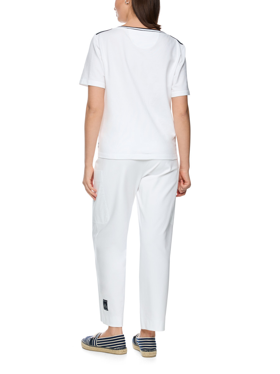 Das T-Shirt mit maritimem Print besticht durch einen lockeren Schnitt und einen breiten U-Boot-Ausschnitt mit gestreiftem Bündchen, der dem Shirt seinen maritimen Charakter verleiht. Der weiche Baumwollmix fühlt sich angenehm auf der Haut an und macht das Shirt zu einem komfortablen Begleiter für den Alltag. Das legere Design mit Aufdruck lässt sich vielseitig kombinieren und eignet sich sowohl für entspannte Freizeitlooks als auch für den Alltag.Lief.-Art-Nr: AS 48.60 J68
