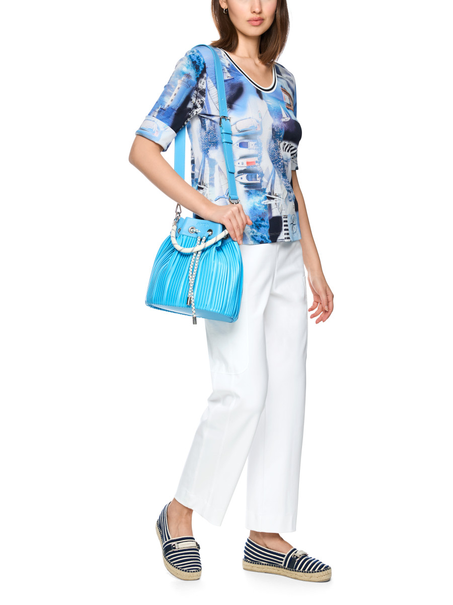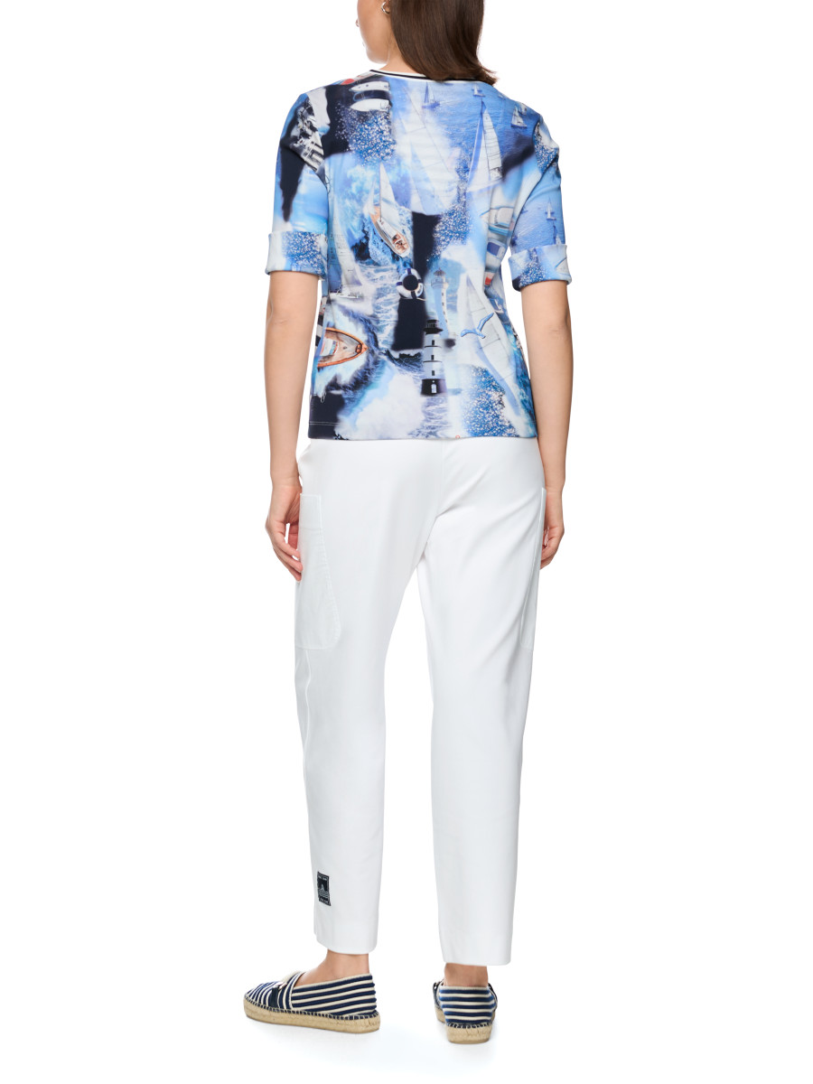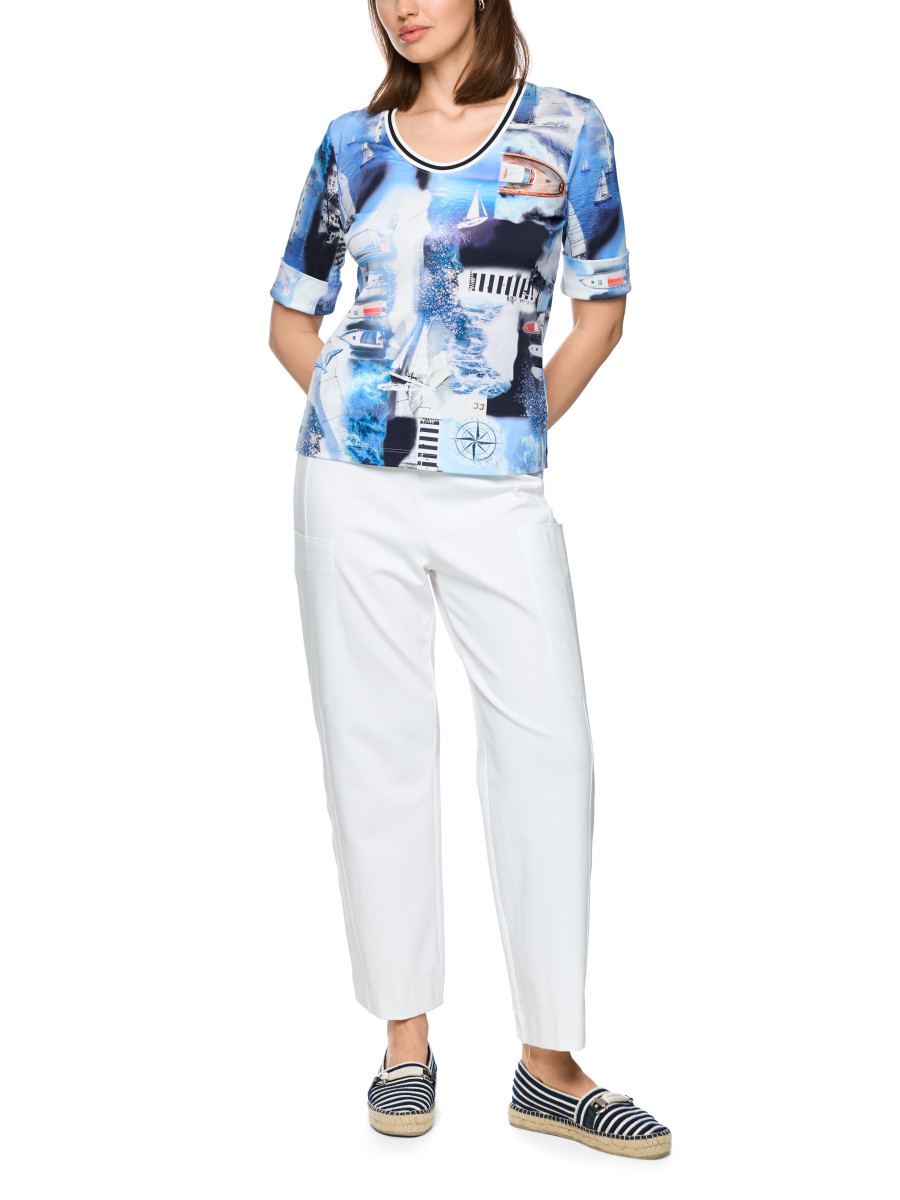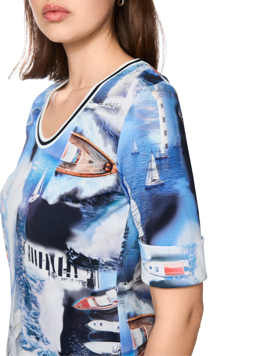 Dieses figurnahe T-Shirt präsentiert sich als lässiges Basic mit maritimem All-over-Print und einem weiten Rundhalsausschnitt. Der Rippstrickstoff und die kurzen Ärmel unterstreichen den entspannten Look, während der angenehme Material-Mix für hohen Tragekomfort sorgt. Das Shirt lässt sich vielseitig kombinieren und eignet sich hervorragend für sommerliche Freizeitlooks.Lief.-Art-Nr: AS 48.19 J64