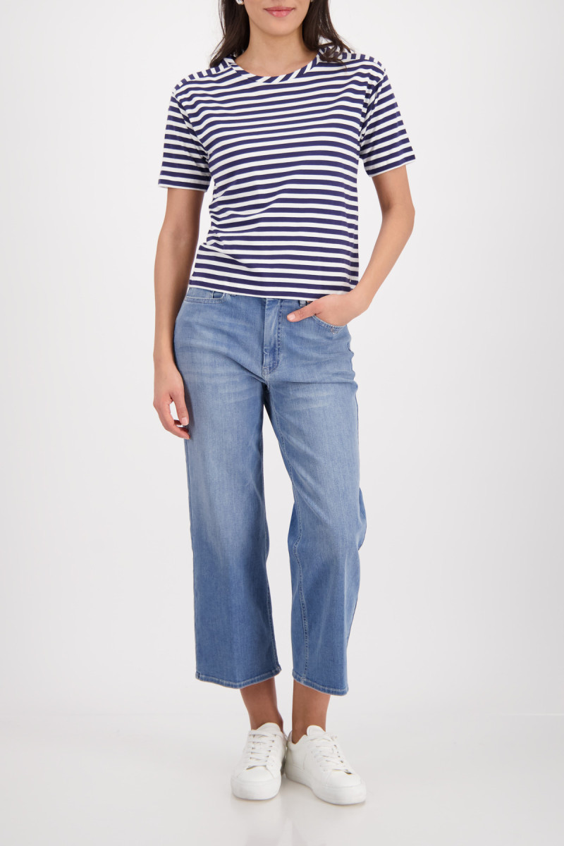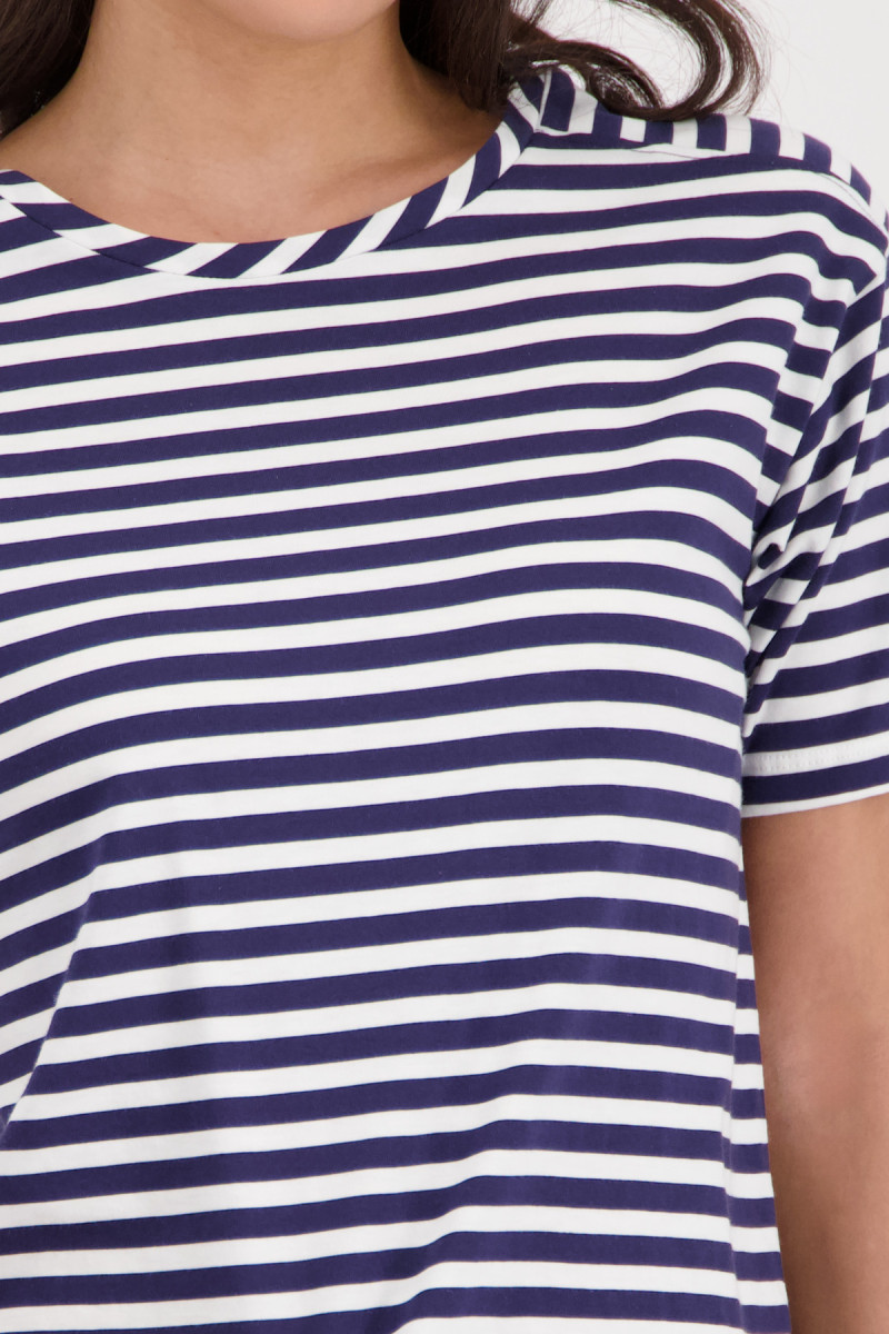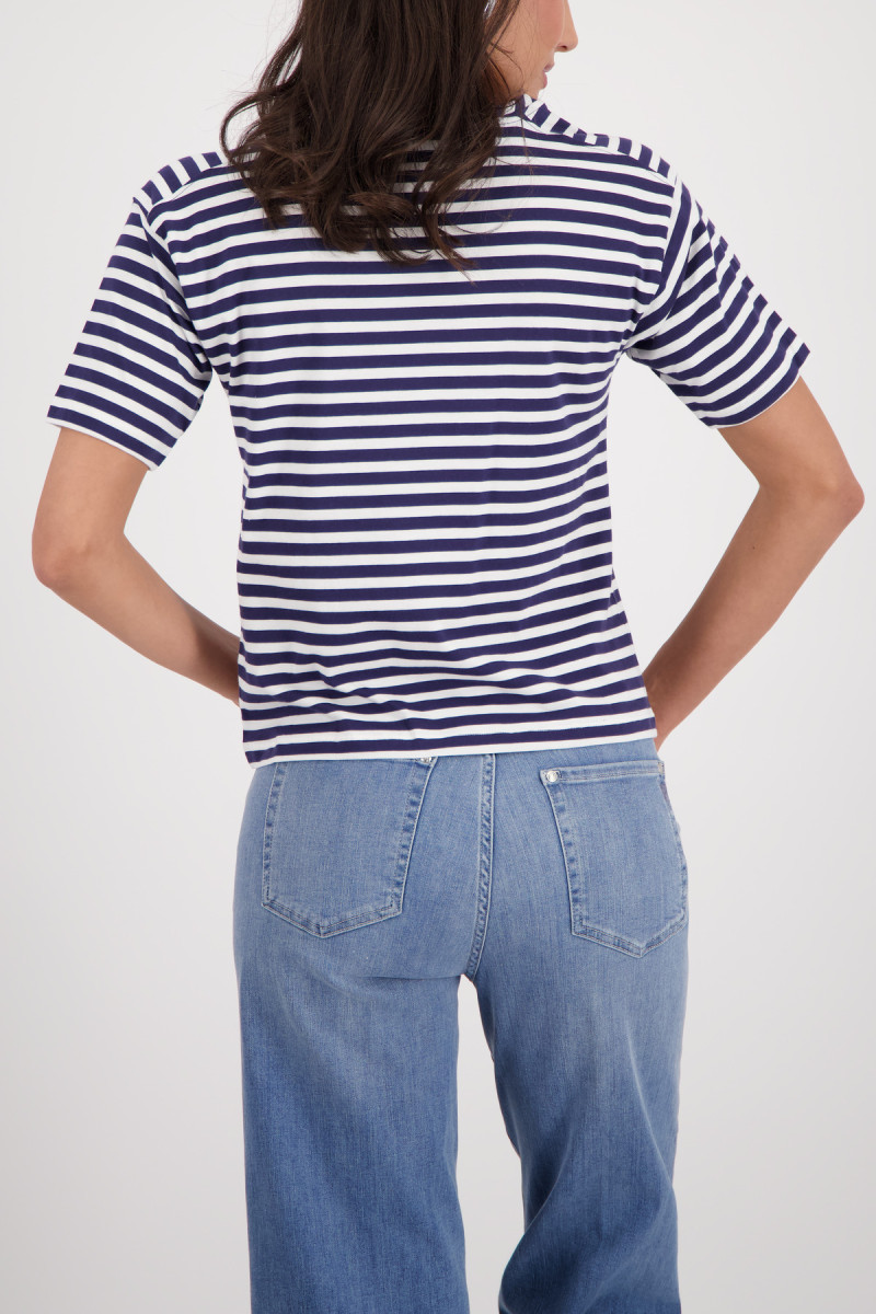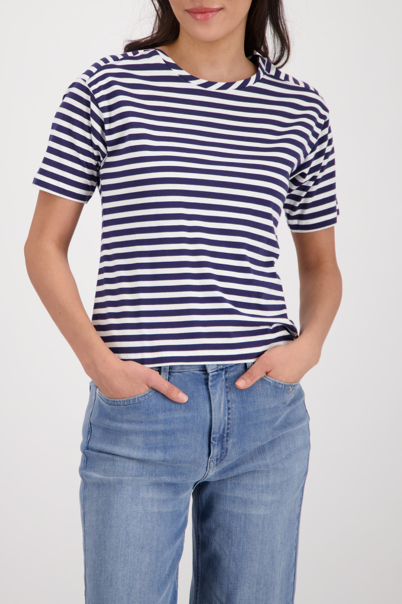 Entdecken Sie stilvolles Flair mit unserem T-Shirt aus 100% Baumwolle, verziert mit zeitlosen Streifen und einem Rundhalsausschnitt.