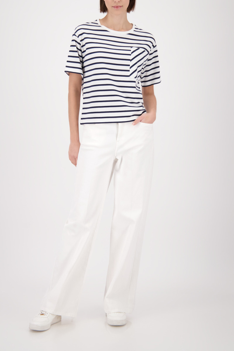 Das gestreifte T-Shirt besticht durch seinen klassischen Rundhalsausschnitt und die kurzen Ärmel, die es zu einem vielseitigen Begleiter im Alltag machen. Die angenehme Mischung aus Baumwolle und Modal sorgt für ein weiches Tragegefühl. Es lässt sich unkompliziert zu Jeans oder Röcken kombinieren und eignet sich für viele Casual-Looks.Lief.-Art-Nr: 410934