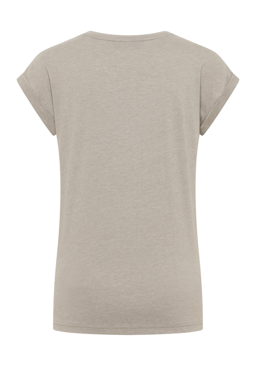Normal geschnittenes T-shirt | Leichte Single Jersey Qualität in Melange Optik mit weichem Griff | V-Auschnitt | Weicher Print auf dem Vorderteil