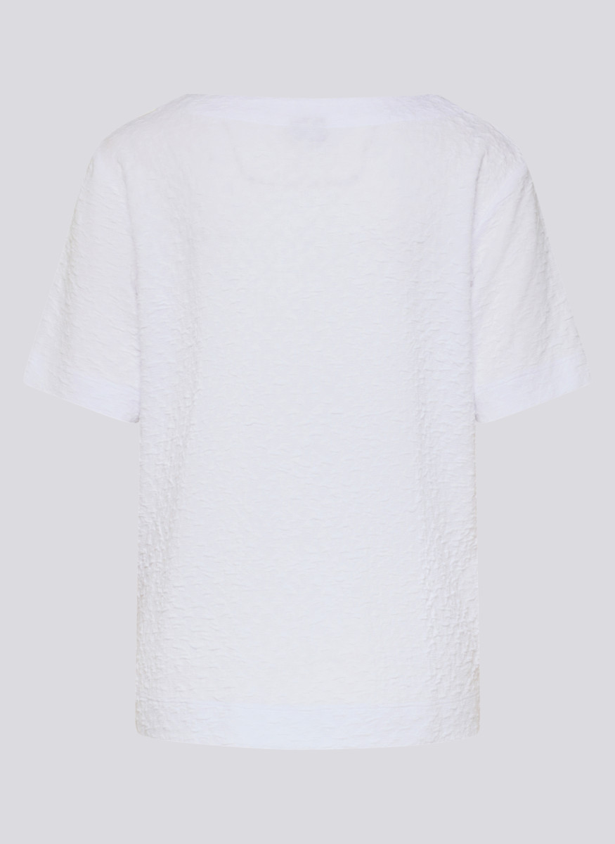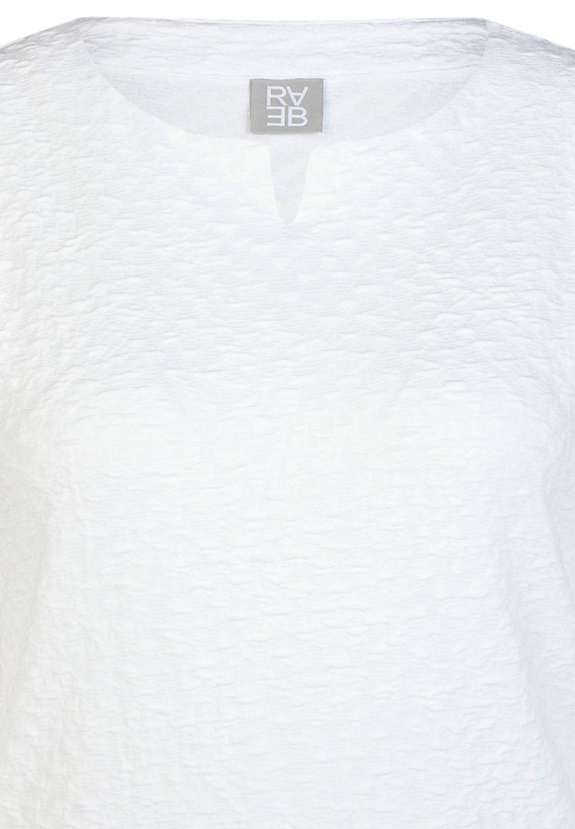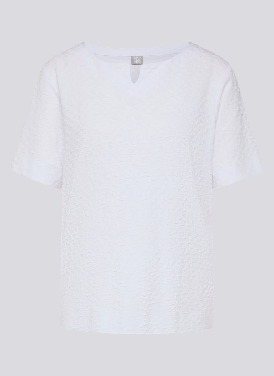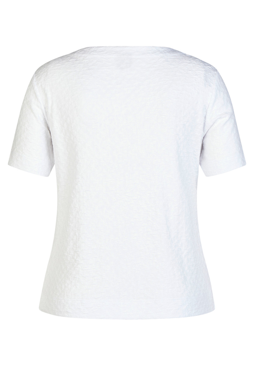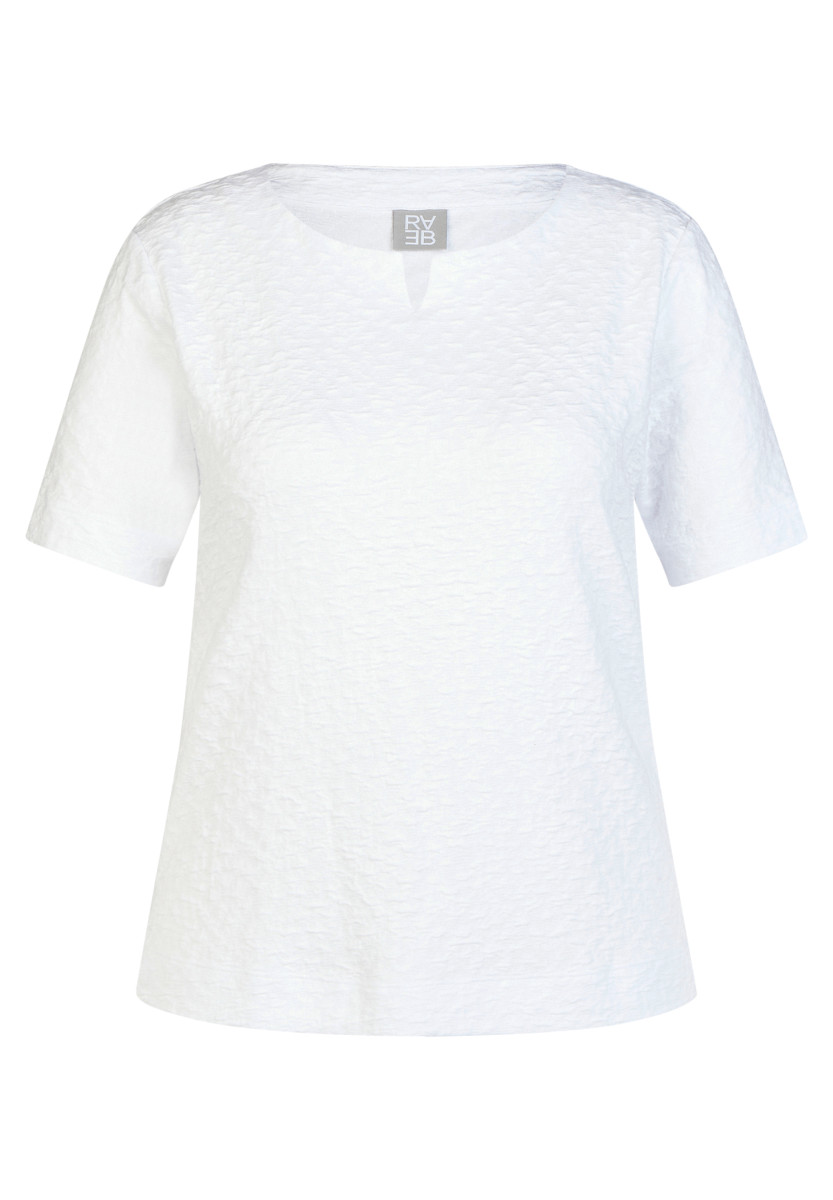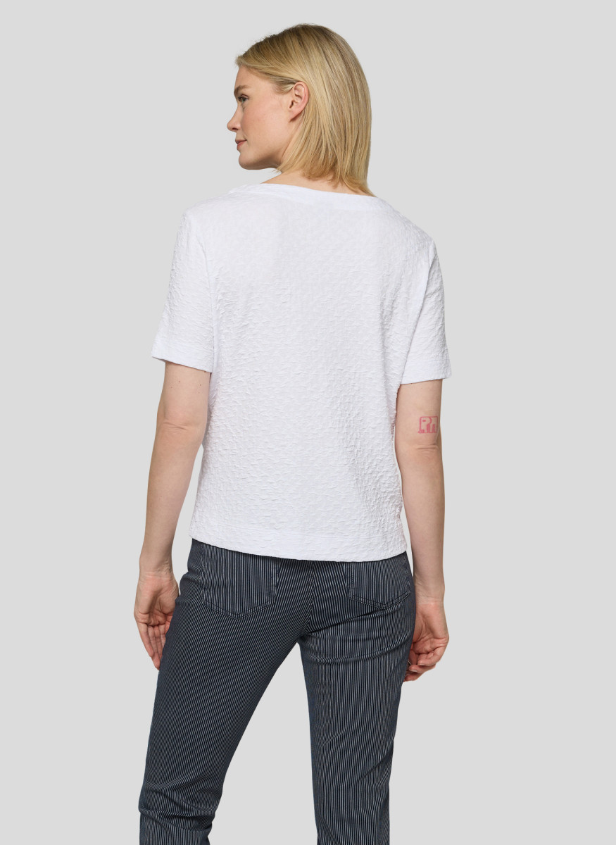 Dieses T-Shirt besticht durch eine fein strukturierte Oberfläche, die dem Modell eine lebendige und dezente Optik verleiht. Die locker fallende Form mit kleinem V-Ausschnitt und Halbarm sorgt für hohen Tragekomfort und viel Bewegungsfreiheit. Seitliche Saumschlitze erleichtern das Kombinieren im Alltag und geben dem Shirt eine entspannte, feminine Note.Lief.-Art-Nr: 56-121318