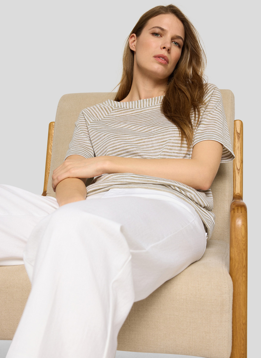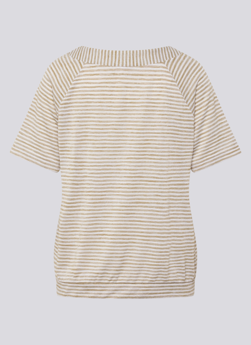 Das T-Shirt überzeugt mit einem feinen Streifenmuster, das für eine zeitlose und unkomplizierte Optik sorgt. Raglanärmel und ein elastischer Saum gewährleisten einen lässigen Sitz und eine angenehme Passform. Der weiche Fall des Materials und die leichte Raffung am Saum machen das Shirt zu einem komfortablen Begleiter im Alltag.Lief.-Art-Nr: 56-122378