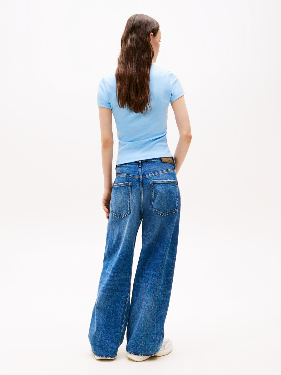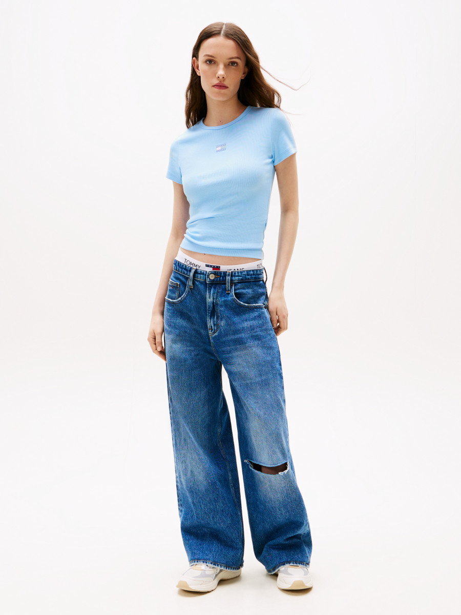 Das Badges-Design auf der Vorderseite gibt dem Shirt einen trendigen und sportlichen Touch. Das Tommy Jeans-Logo oder die Marken-Patches setzen markante Akzente und verleihen dem T-Shirt eine gewisse Individualität, die typisch für den Urban-Look der Marke ist.