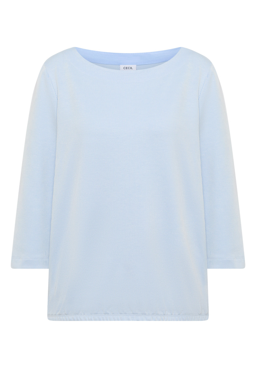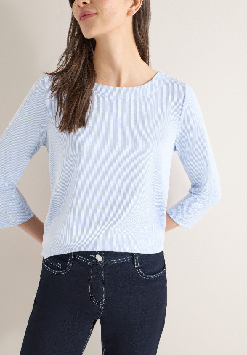 Das gestreifte Shirt von CECIL für Damen punktet mit einem femininen U-Boot-Ausschnitt und einem feinen Streifenmuster. Der 3/4-Arm und der elastische Saum sorgen für eine bequeme Passform. Ideal für unkomplizierte Looks mit maritimem Flair.