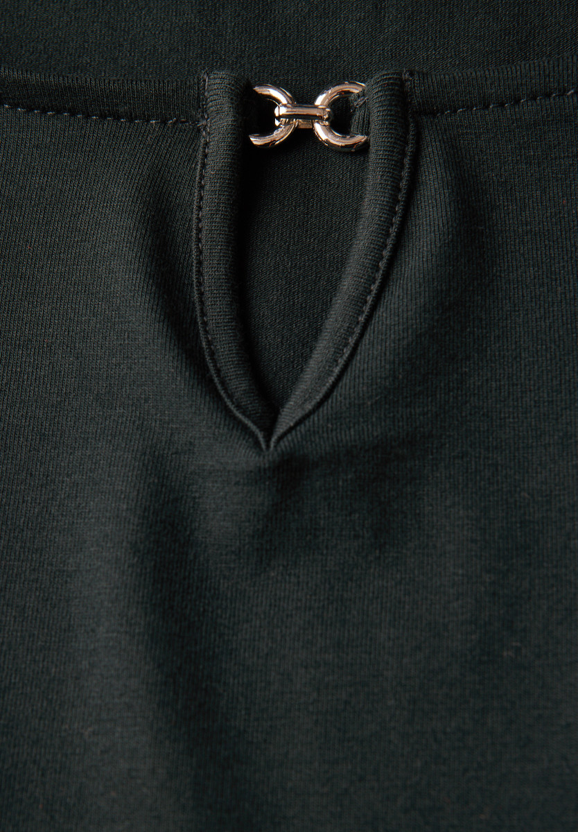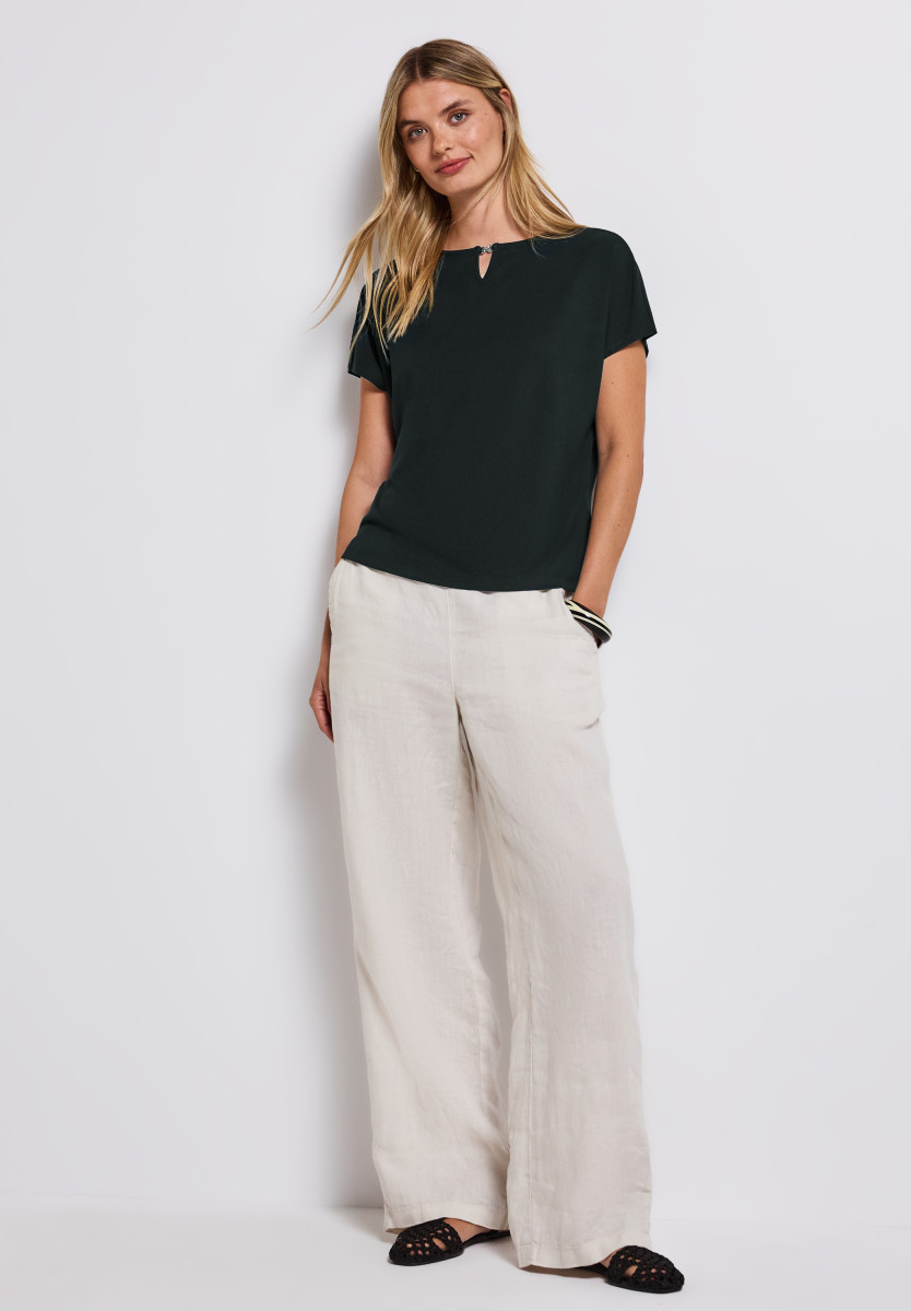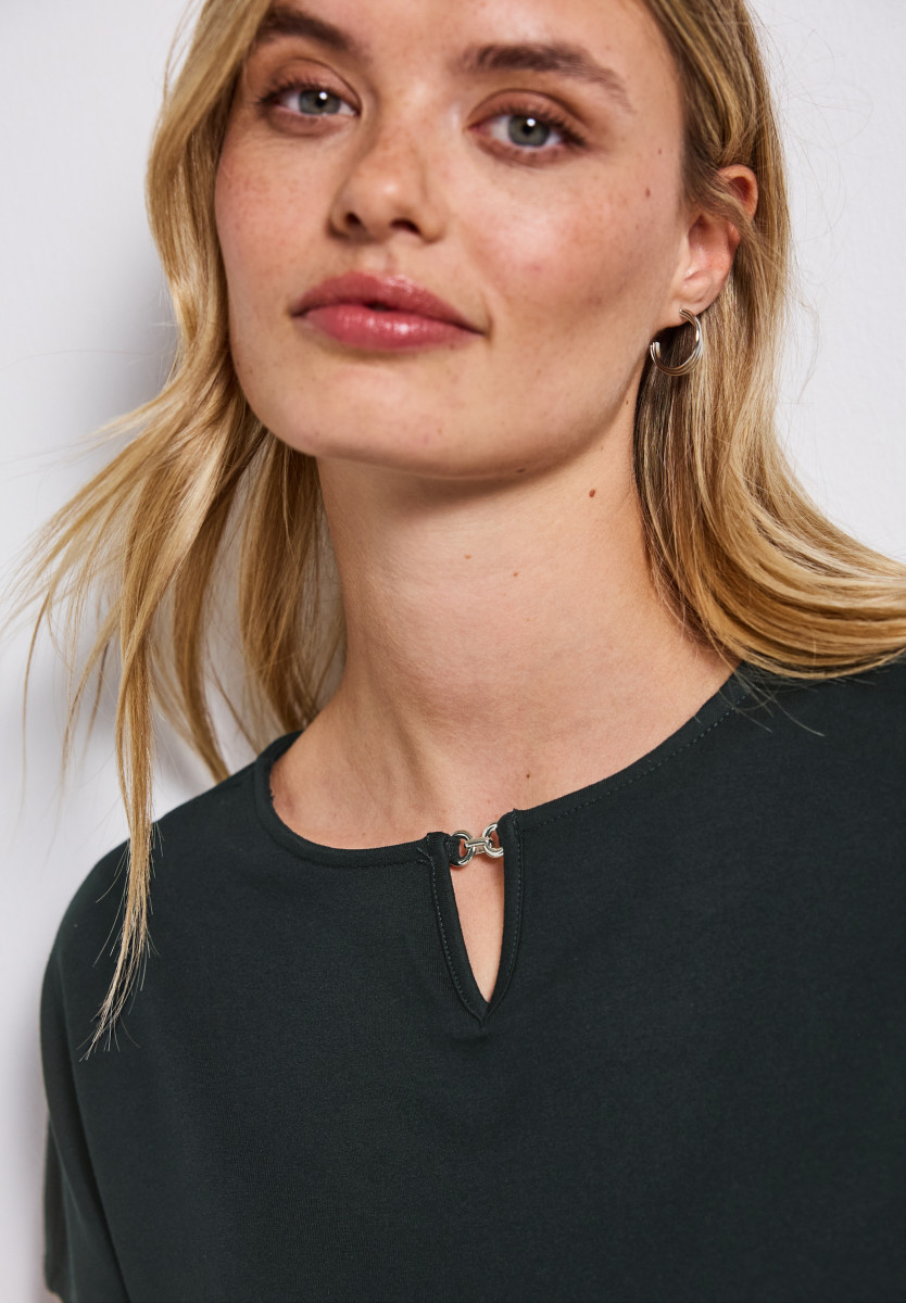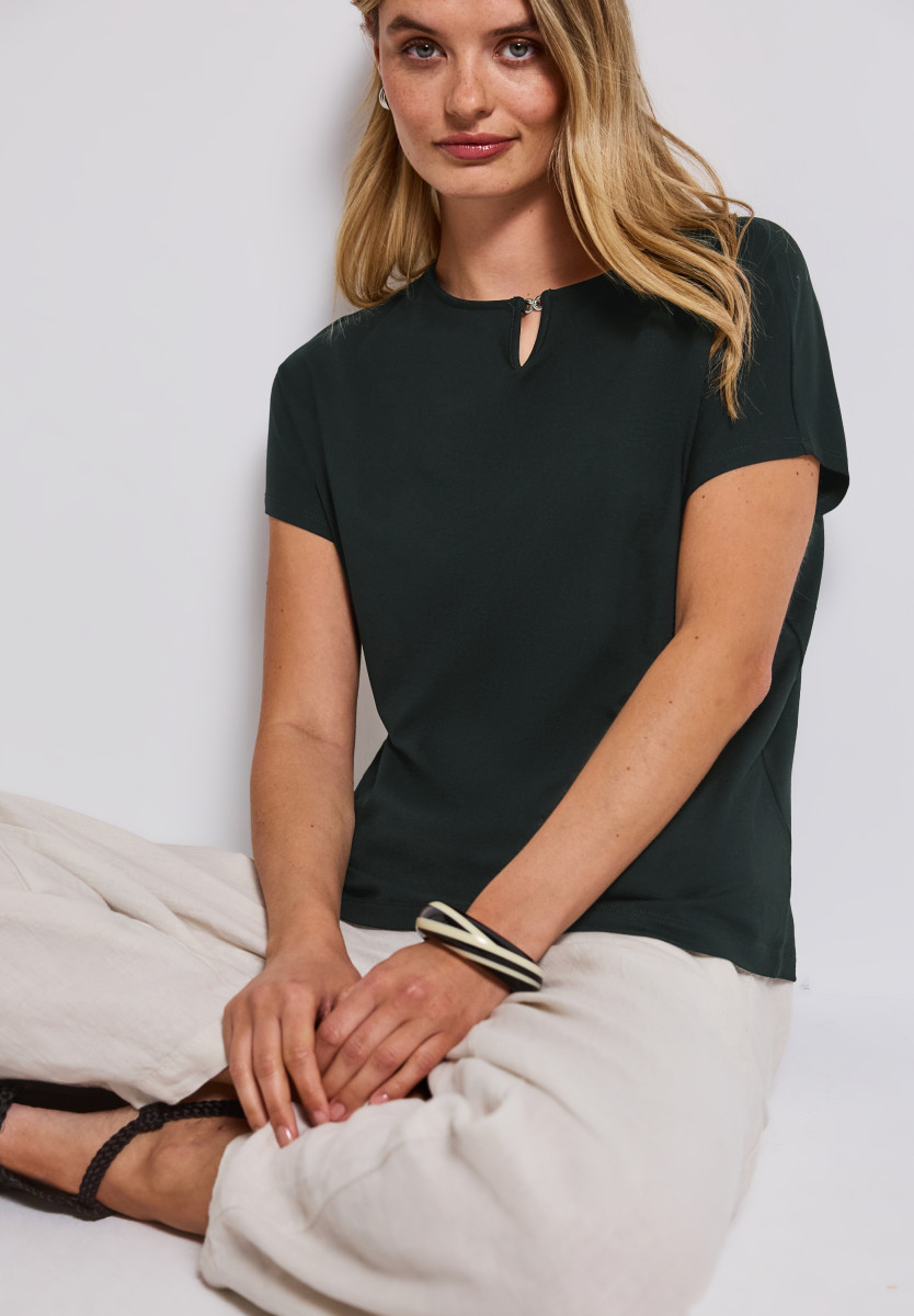 Das unifarbene Shirt von Street One für Damen punktet mit einem dekorativen Cut-Out am U-Boot-Ausschnitt. Der Viskosemix mit Stretchanteil bietet dir ein geschmeidiges Tragegefühl, während die Dropped Shoulders eine moderne Note setzen. Ideal für minimalistische Sommer-Looks. Sommershirt U-Boot-Ausschnitt mit Cut-Out Dropped Shoulders Unifarbe Viskosemix mit Stretchanteil