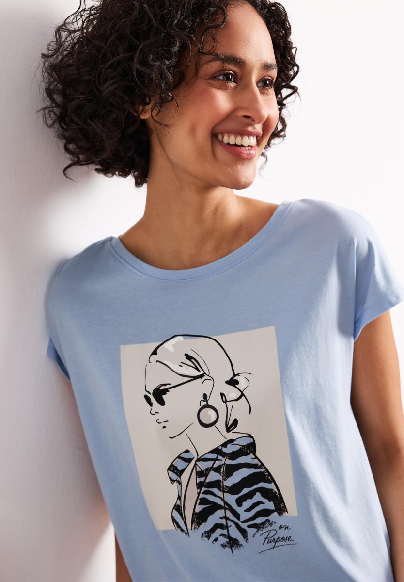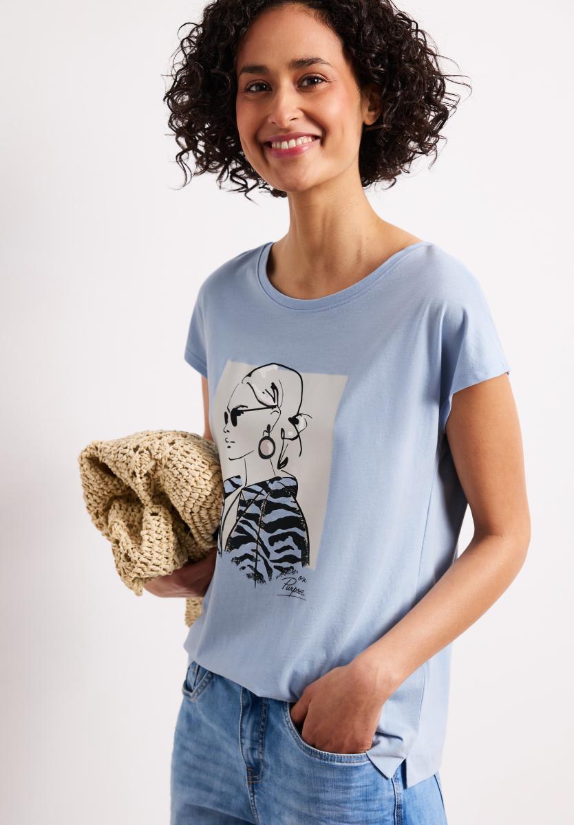 Das T-Shirt mit Print von Street One für Damen überzeugt mit einem femininen Frontprint und lässigem Casual-Charakter. Der softe Baumwoll-Modalmix sorgt für ein angenehm weiches Tragegefühl und hohen Komfort im Alltag. Dropped Shoulders unterstreichen die entspannte Silhouette, während der Rundhalsausschnitt den Look harmonisch abrundet. Ideal für modische Everyday-Outfits mit persönlicher Note.