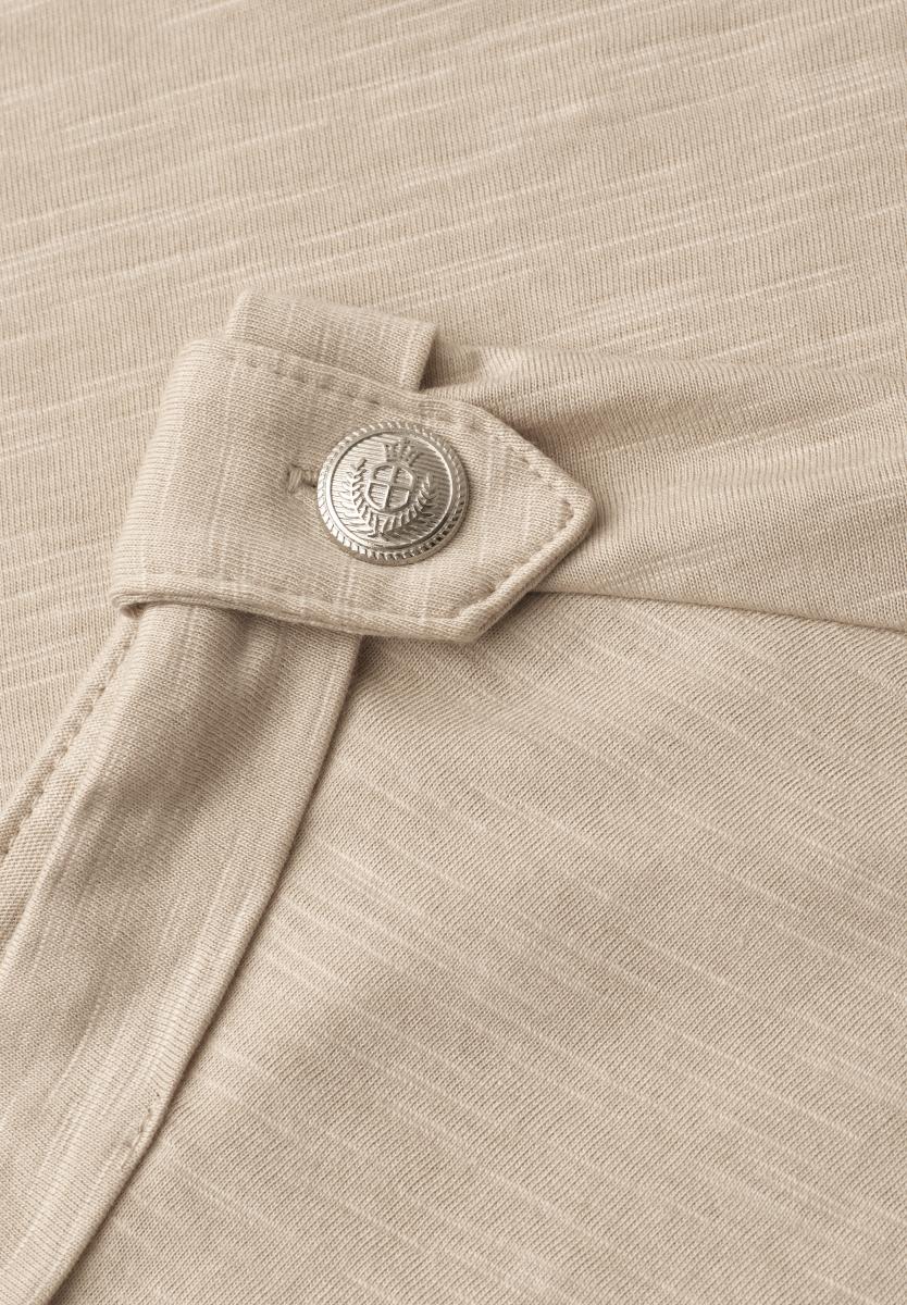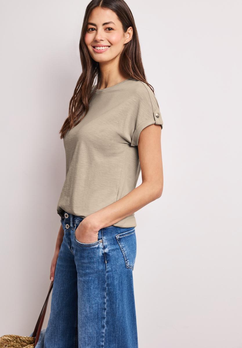 Das T-Shirt von Street One für Damen punktet als vielseitiges Essential mit dezenten Knopfdetails am Kurzarm. Der klassische Rundhalsausschnitt unterstreicht den lässigen Casual-Stil und macht das Shirt zum unkomplizierten Begleiter im Alltag. Der softe Baumwoll-Modalmix sorgt für ein angenehm weiches Tragegefühl. In Unifarbe gehalten, lässt sich das Jerseyshirt mühelos in viele Looks integrieren.