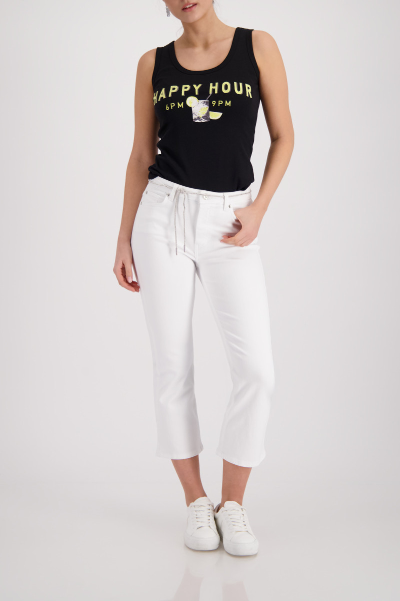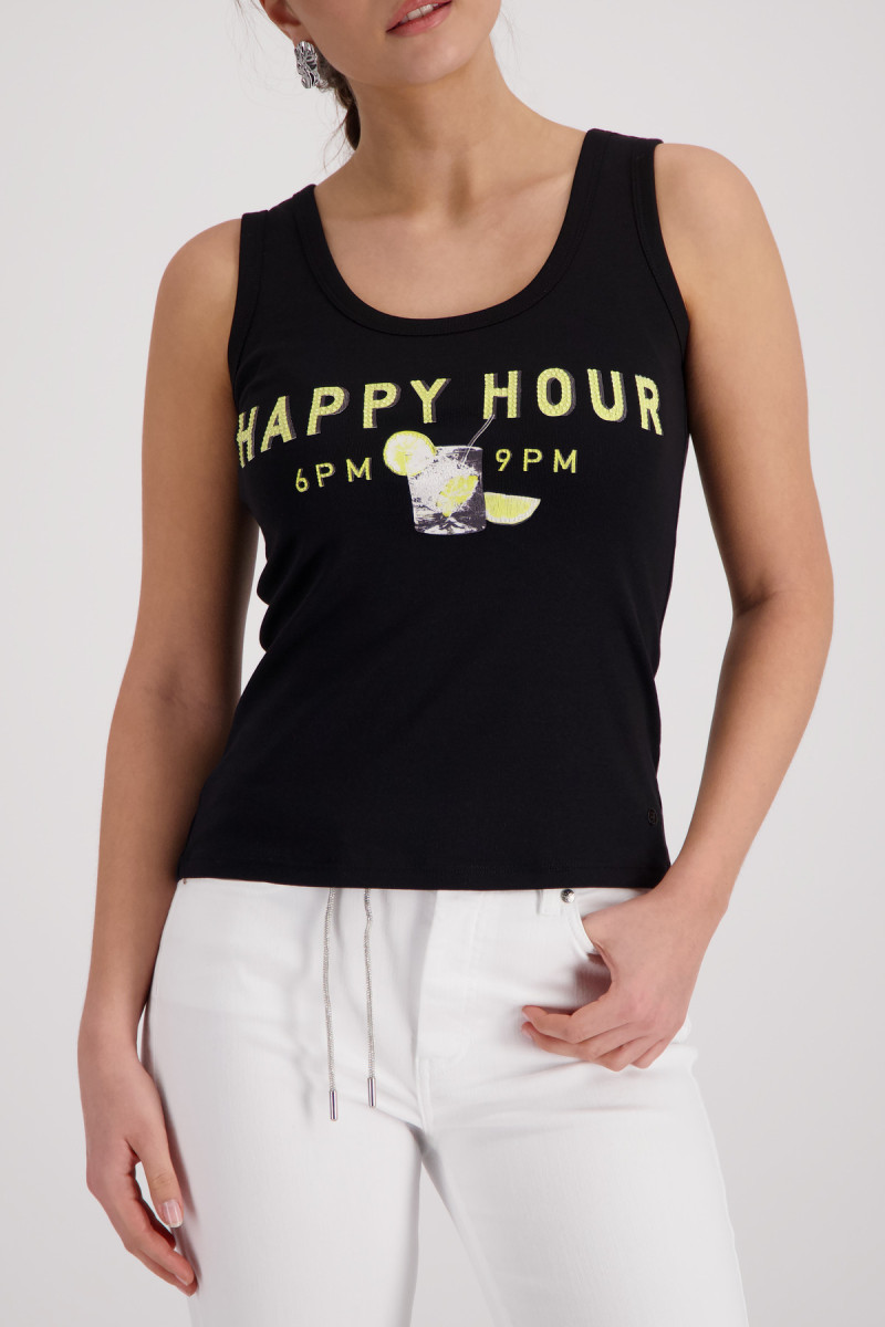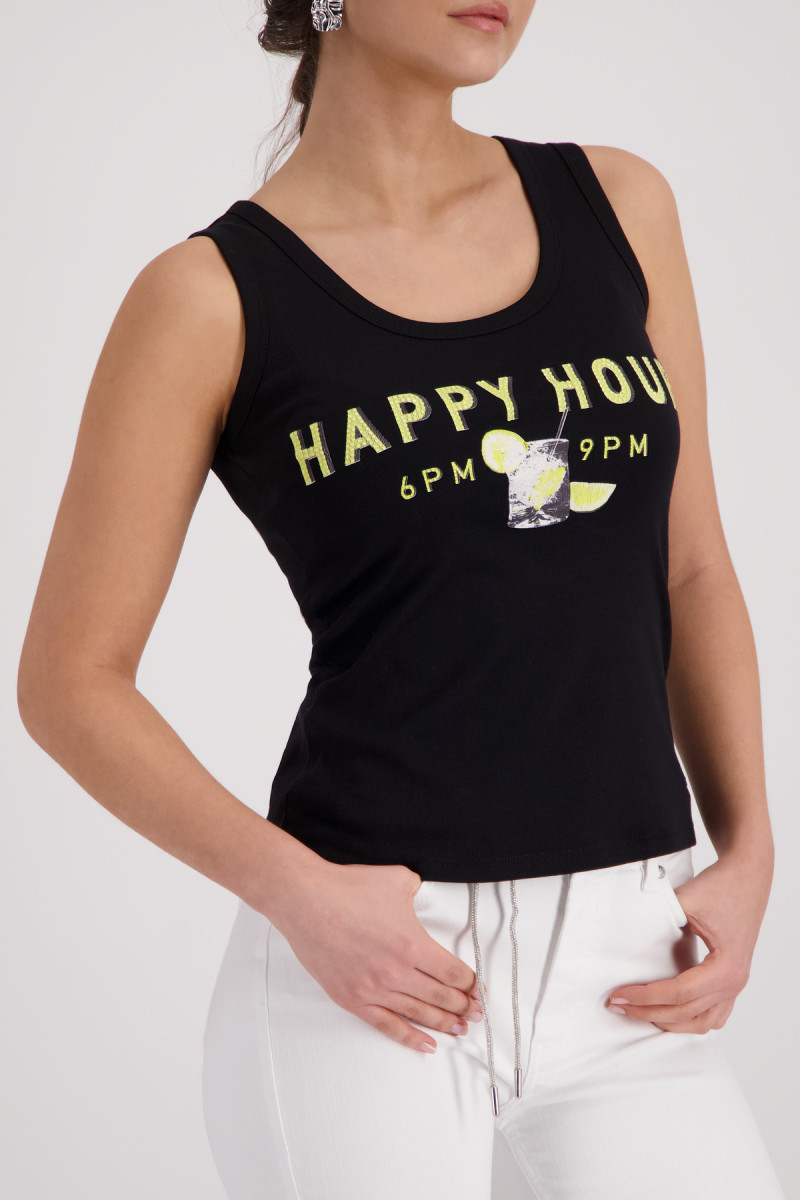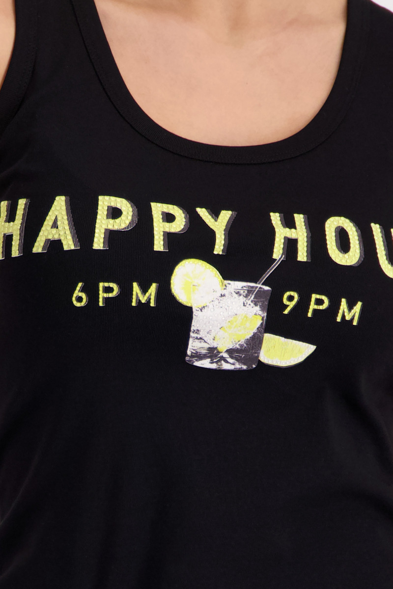 Stylisches Tanktop aus 100% Baumwolle mit weicher Haptik, funkelndem "Happy Hour"-Schriftzug und Strasssteinen. Perfekter Regular Fit für jeden Anlass.Lief.-Art-Nr: 410765