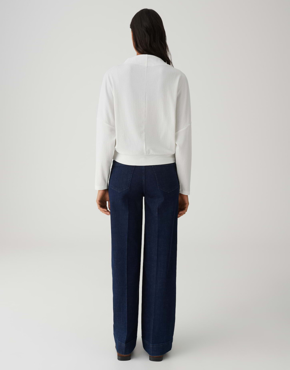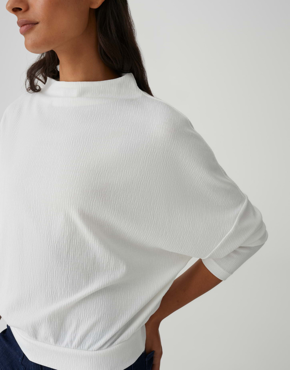 Dieses moderne Oberteil begeistert mit einer lockeren Passform und einem schmal zulaufenden Schnitt, der eine zeitgemäße Silhouette schafft. Der lange Fledermausärmel verleiht dem Design eine lässige Eleganz und sorgt zugleich für angenehme Bewegungsfreiheit. Ein stilvoller Funnel Neck setzt einen modischen Akzent und rundet den Look harmonisch ab. Gefertigt aus hochwertigem Jersey mit dezenter Struktur überzeugt das Material durch seinen weichen Griff und ein besonders angenehmes Tragegefühl. Die leichte Transparenz in hellen Nuancen unterstreicht die feine Materialqualität, während ein schmales Bündchen für einen sauberen Abschluss sorgt. Mit einer Rückenlänge von ca. 57 cm in Größe 36 und getragen von einem 178 cm großen Model in derselben Größe eignet sich dieses Oberteil ideal für vielseitige Kombinationen – von casual bis modern-elegant.