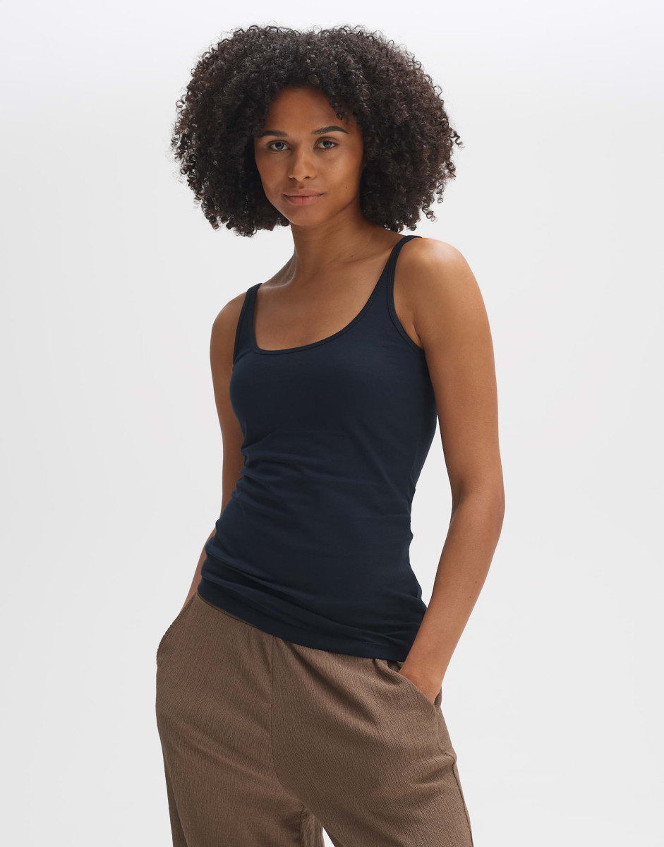 Schmale Passform | Figurbetont | Weiter Rundhalsausschnitt | Rückenlänge ca. 63 cm bei Größe 36 | Model Größe 181 cm – trägt Größe 36 | BCI Cotton Mix | Weicher Griff | Elastischer Stoff | Schmale Träger