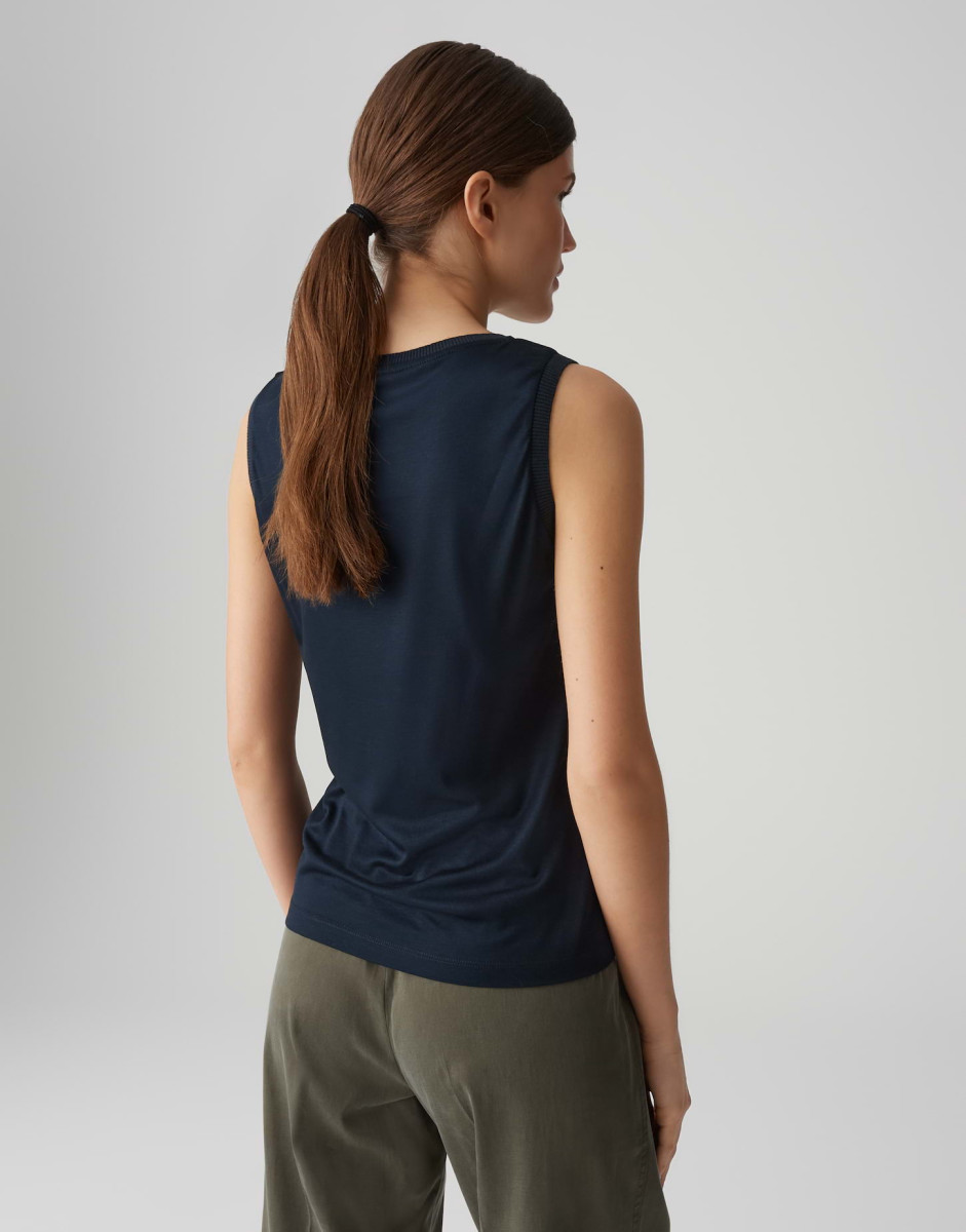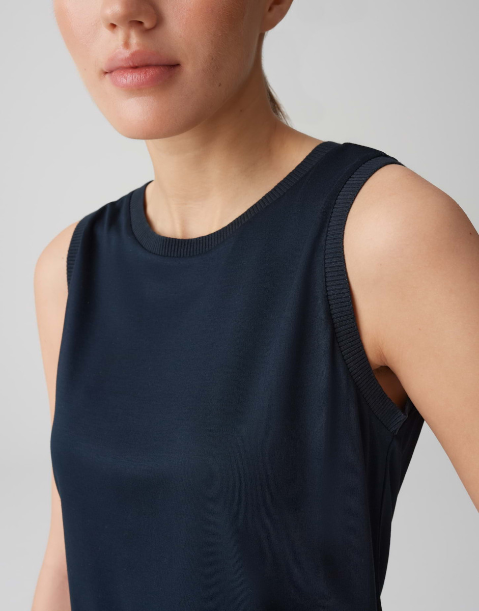 Lockere Passform | Gerader Schnitt | Ärmellos | Rundhalsausschnitt | Rückenlänge ca. 58 cm bei Größe 36 | Model Größe 177 cm – trägt Größe 36 | Jersey | Weicher Griff | Elastischer Stoff | Dezenter Schimmer | Schmale Rippbündchen