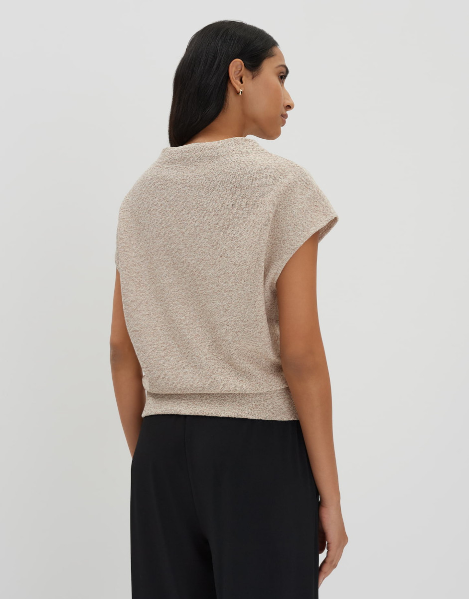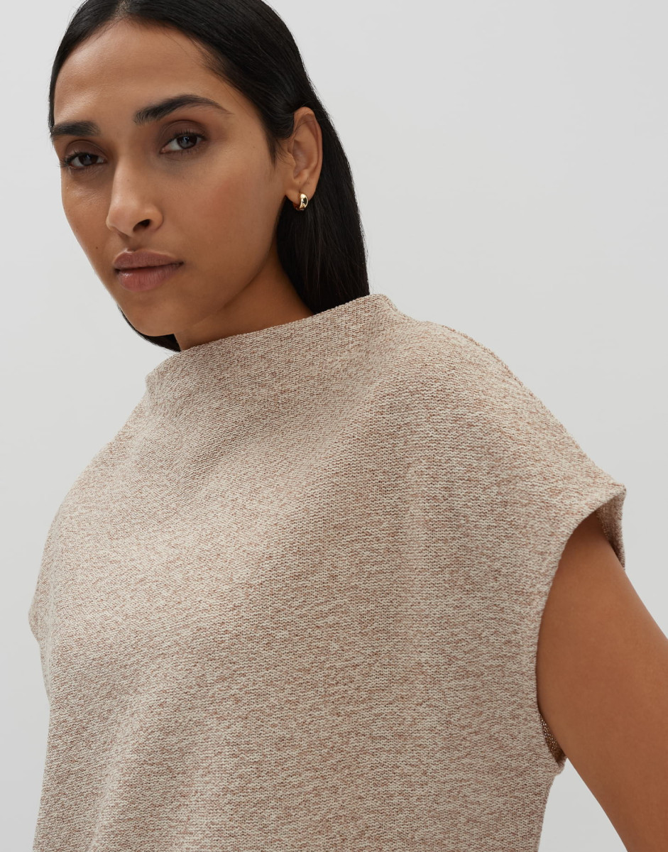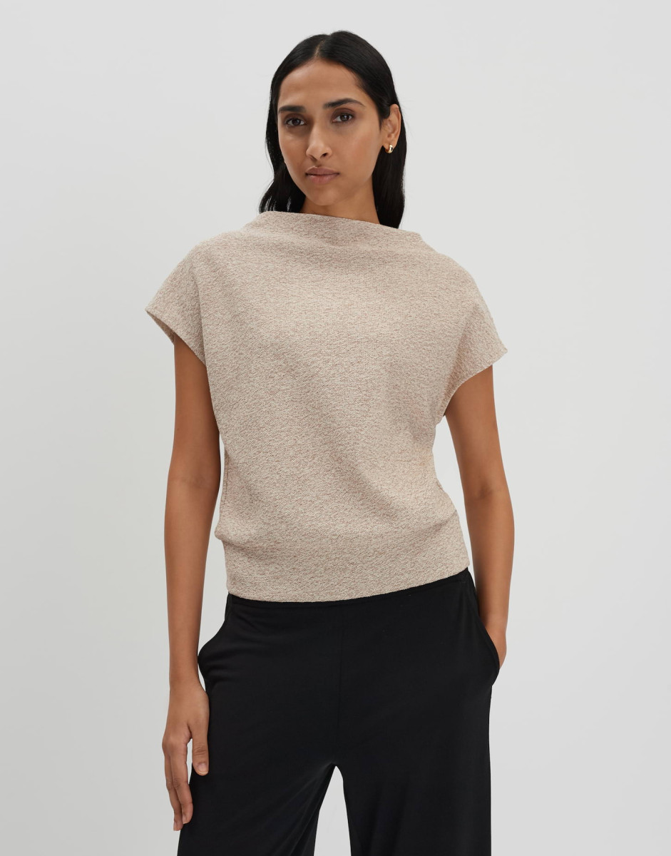 Lockere Passform | Schmal zulaufend | Überschnittener Kurzarm | Funnel Neck | Rückenlänge ca. 54 cm bei Größe 36 | Model Größe 177 cm – Trägt Größe 36 | Jersey | Strickoptik | Natürlicher Griff | Weich fließender Fall | Schmaler Gummibund