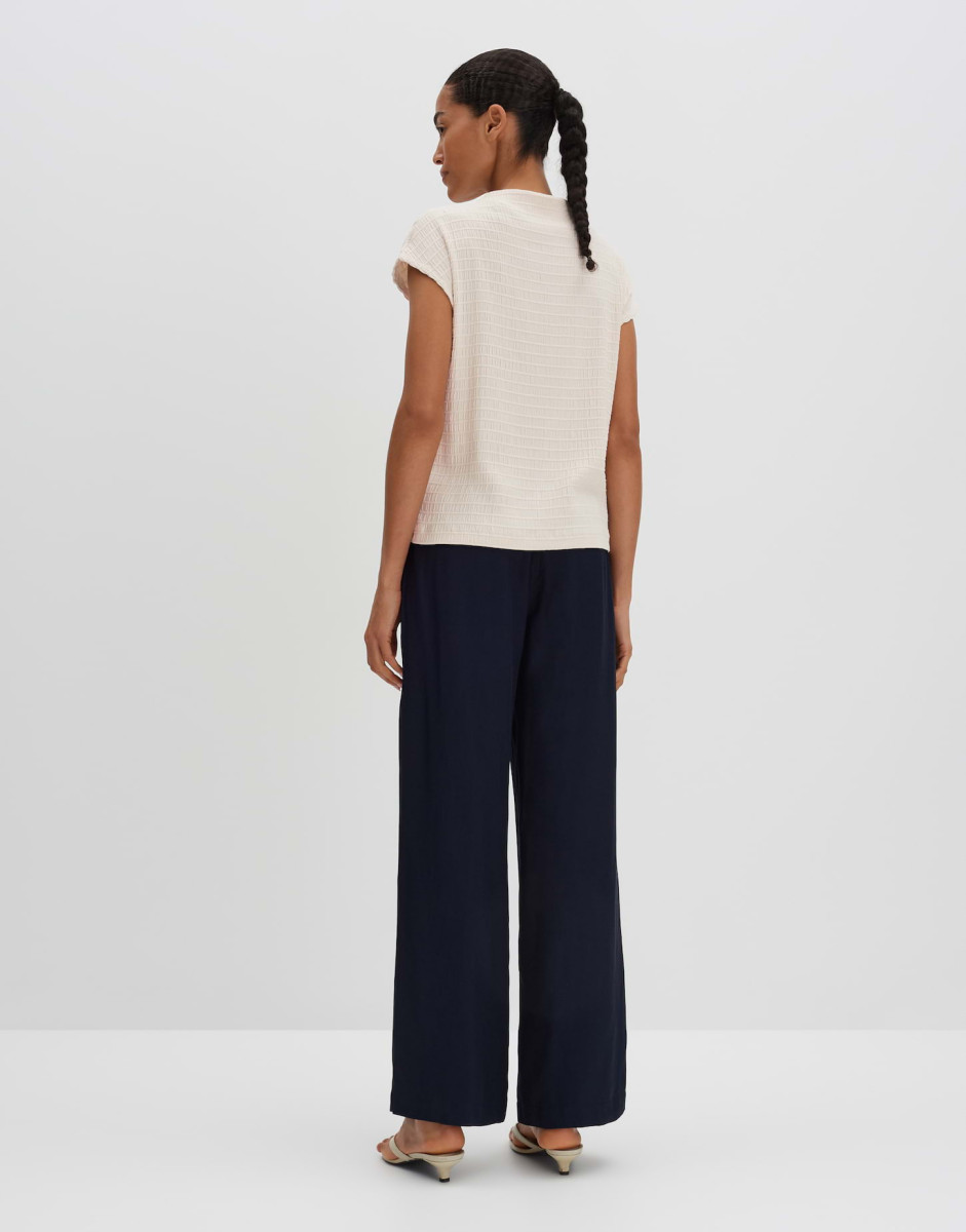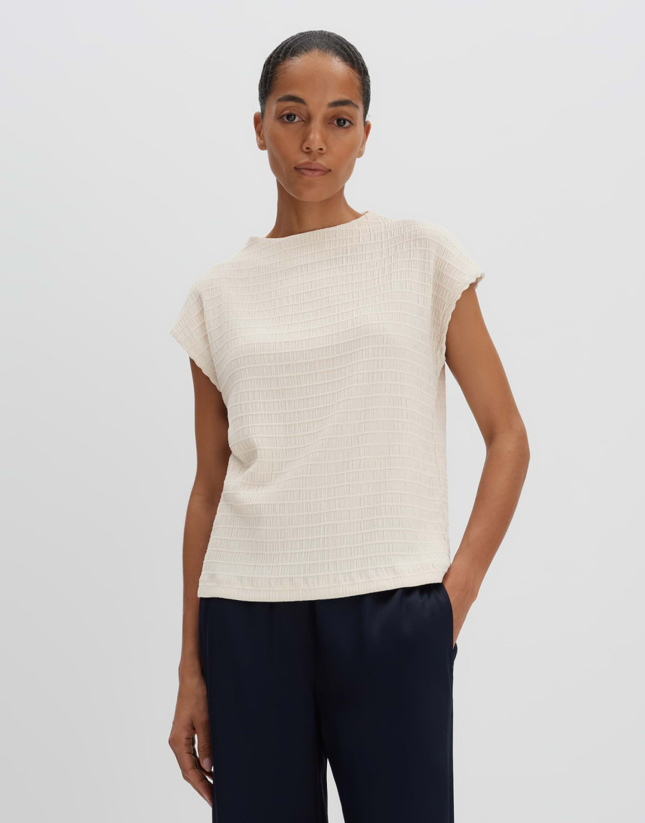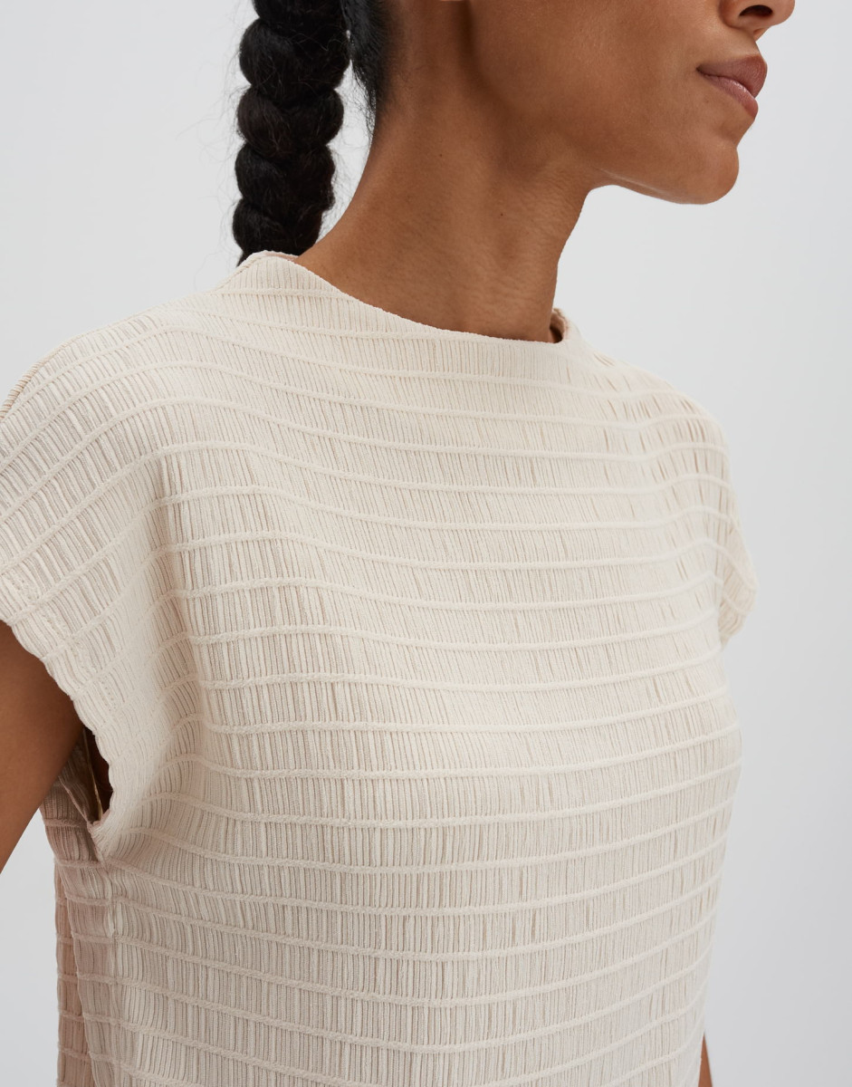 Normale Passform | Gerader Schnitt | Überschnittener Kurzarm | Funnel Neck | Rückenlänge ca. 56 cm bei Größe 36 | Model Größe 176 cm – trägt Größe 36 | Jersey | 3-dimensionale Struktur | Natürlicher Griff | Elastischer Stoff | Weich fließender Fall | Streifenmuster