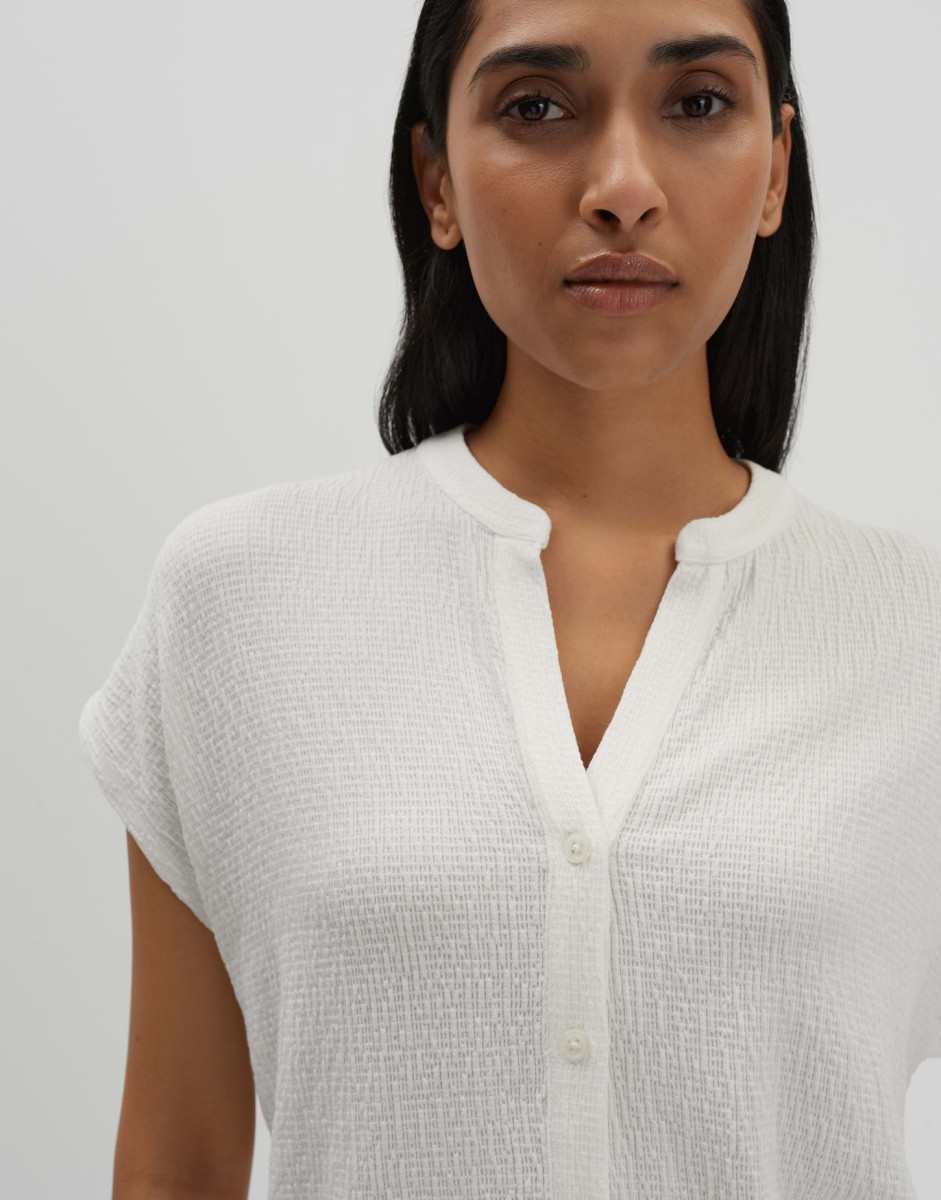 lockere Passform, gerader Schnitt, normale Länge, überschnittener Kurzarm, Rundhals mit V-Ausschnitt, Rückenlänge ca. 56 cm bei Größe S, Model Größe 177 cm – trägt Größe S, Jersey, strukturierte Oberfläche, weicher Griff, elastischer Stoff, lange Knopfleiste