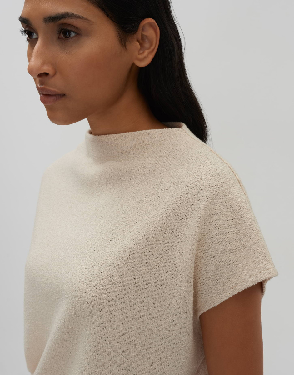 Lockere Passform | Boxy Silhouette | Verkürzte Länge | Überschnittener Kurzarm | Funnel Neck | Rückenlänge ca. 54 cm bei Größe 36 | Model Größe 177 cm – trägt Größe 36 | Jersey | Bouclé Struktur | Natürlicher Griff | Elastischer Stoff | Weich fließender Fall