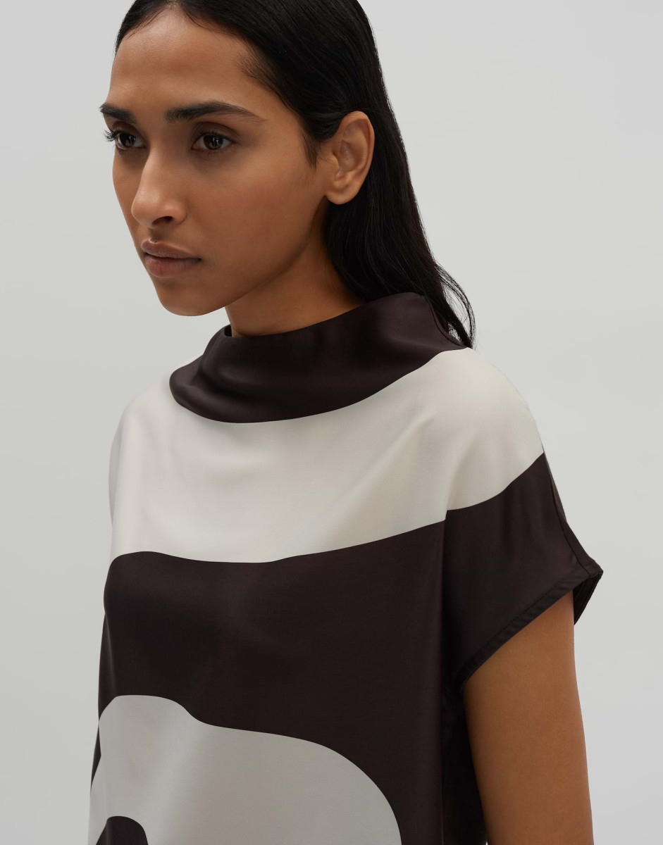 Lockere Passform | Gerader Schnitt | Normale Länge | Überschnittene Schulter mit Kurzarm | Funnel Neck | Rückenlänge ca. 56 cm bei Größe 36 | Model Größe 177 cm – trägt Größe 36 | Webware | Jersey im Rücken | Weicher Griff | Fließender Fall | Abstrakter Print