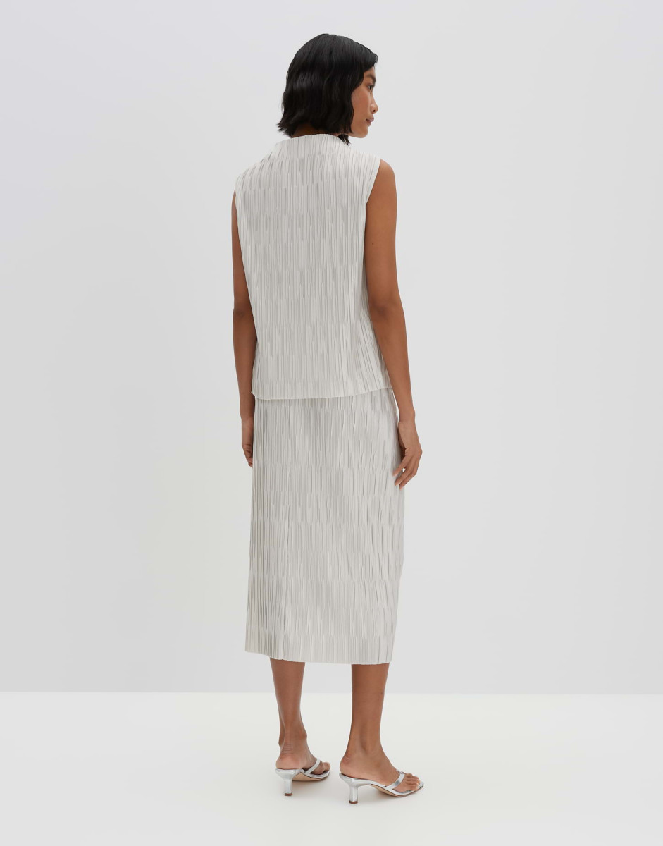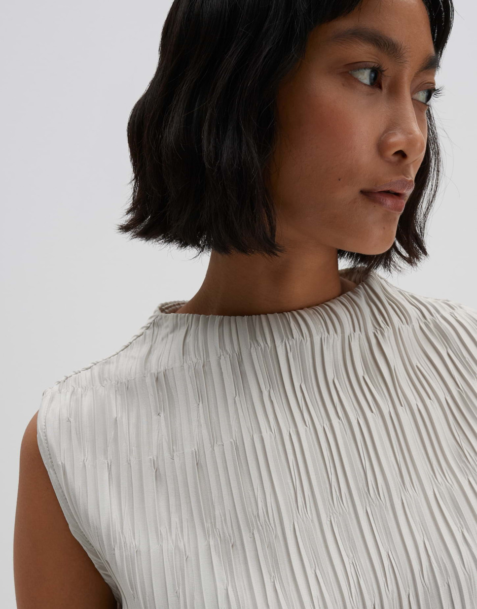 Schmale Passform | Figurbetont geschnitten | Normale Länge | Ärmellos | Funnel Neck | Rückenlänge ca. 58 cm bei Größe 36 | Model Größe 176 cm – trägt Größe 36 | Jersey | Plissierte Struktur | Kühler Griff | Satinierte Oberfläche