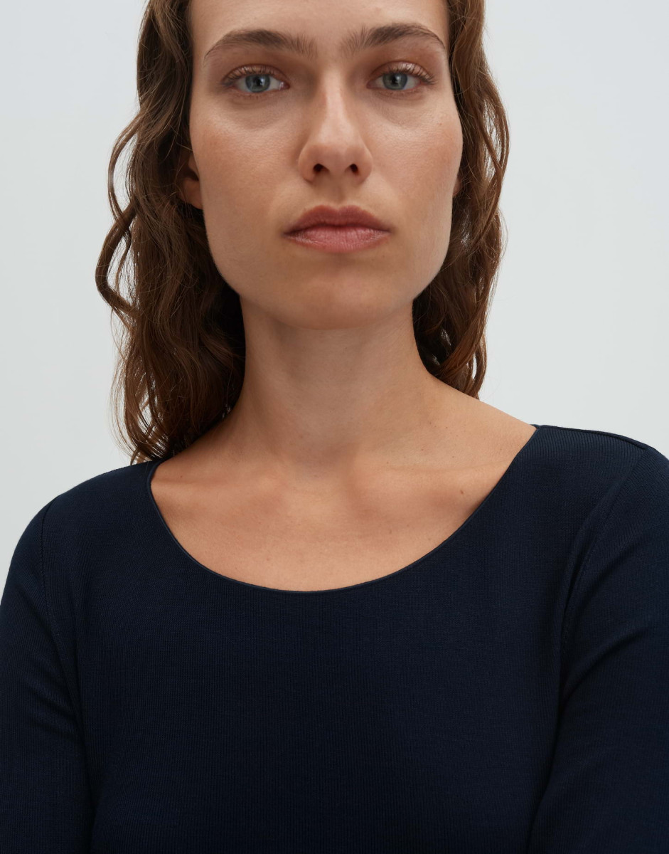 Dieses klassische Langarmshirt ist ein unverzichtbares Basic für jede Garderobe. Es zeichnet sich durch seine schlichte Eleganz und eine figurbetonte, schmale Passform aus, die es ideal zum Layering oder als Solostück macht. Das Material weist eine feine Ripp- oder Strukturstrick-Optik auf, die für eine dezente Textur und angenehme Dehnbarkeit sorgt. Der weite, feminine Rundhalsausschnitt (Scoop Neck) betont sanft das Dekolleté. Dank der langen Ärmel und des hochwertigen Materials bietet das Oberteil optimalen Komfort und ist vielseitig kombinierbar. Es passt perfekt unter Blazer, Strickjacken oder zu hoch taillierten Röcken und Hosen und liefert die ideale Basis für unzählige Alltags- und Business-Looks.