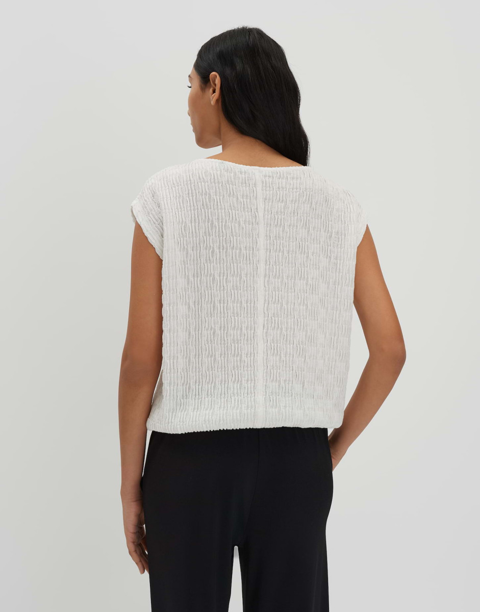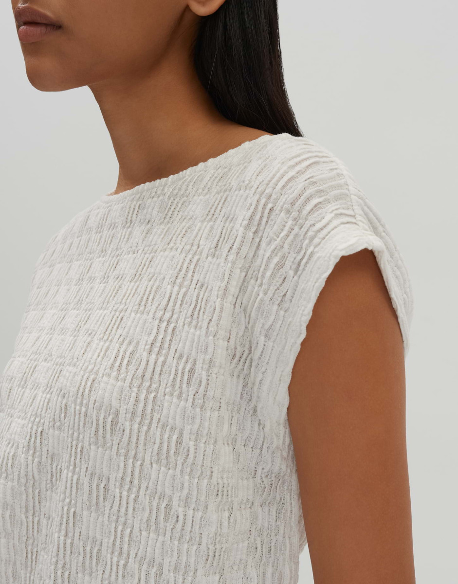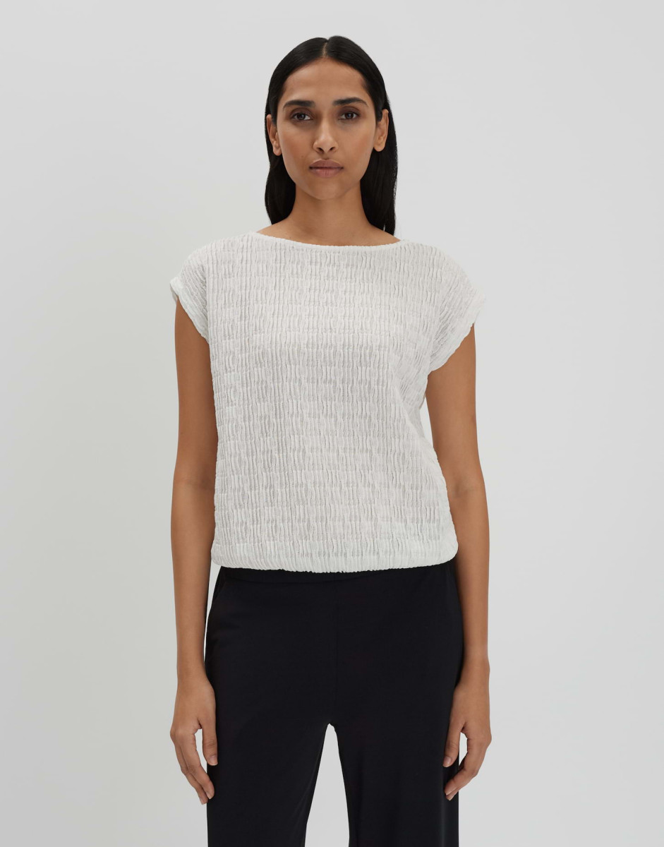 Lockere Passform | Schmal zulaufend | Normale Länge | Überschnittene Schulter mit Kurzarm | U-Boot-Ausschnitt | Rückenlänge ca. 56 cm bei Größe 36 | Model Größe 177 cm – trägt Größe 36 | Jersey | Moderner Smok Effekt | Weicher Griff | Elastischer Stoff | Schmaler Gummibund | Längsnaht hinten