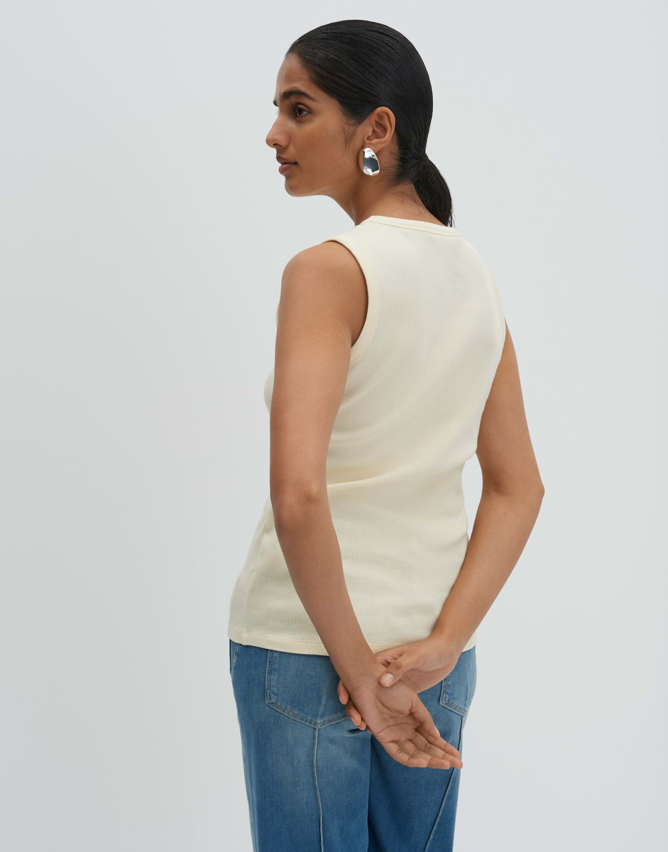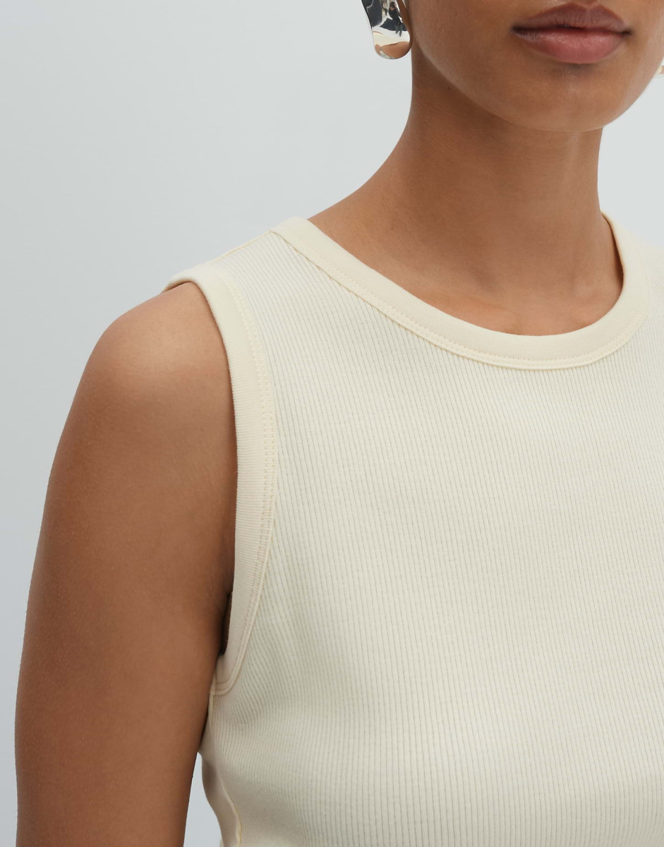Figurbetont geschnittenes Damen T-Shirt mit schmaler Passform und Rundhalsausschnitt für einen cleanen, zeitlosen Look. Das ärmellose Shirt hat eine normale Länge und zeigt eine feine Rippstruktur in weich fallendem Jersey. Der elastische Stoff sorgt für angenehmen Sitz und der BCI Cotton Mix verleiht dem Shirt eine hochwertige Haptik.