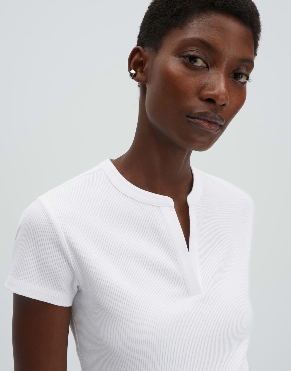 Figurbetont geschnittenes Top mit schmaler Passform, Stehkragen und kleinem V‑Ausschnitt vorne. Das Top hat kurze Ärmel und eine körpernahe Silhouette. Die Rippstruktur bietet starke Rücksprungkraft und das Material stammt aus einem BCI Cotton Mix.
