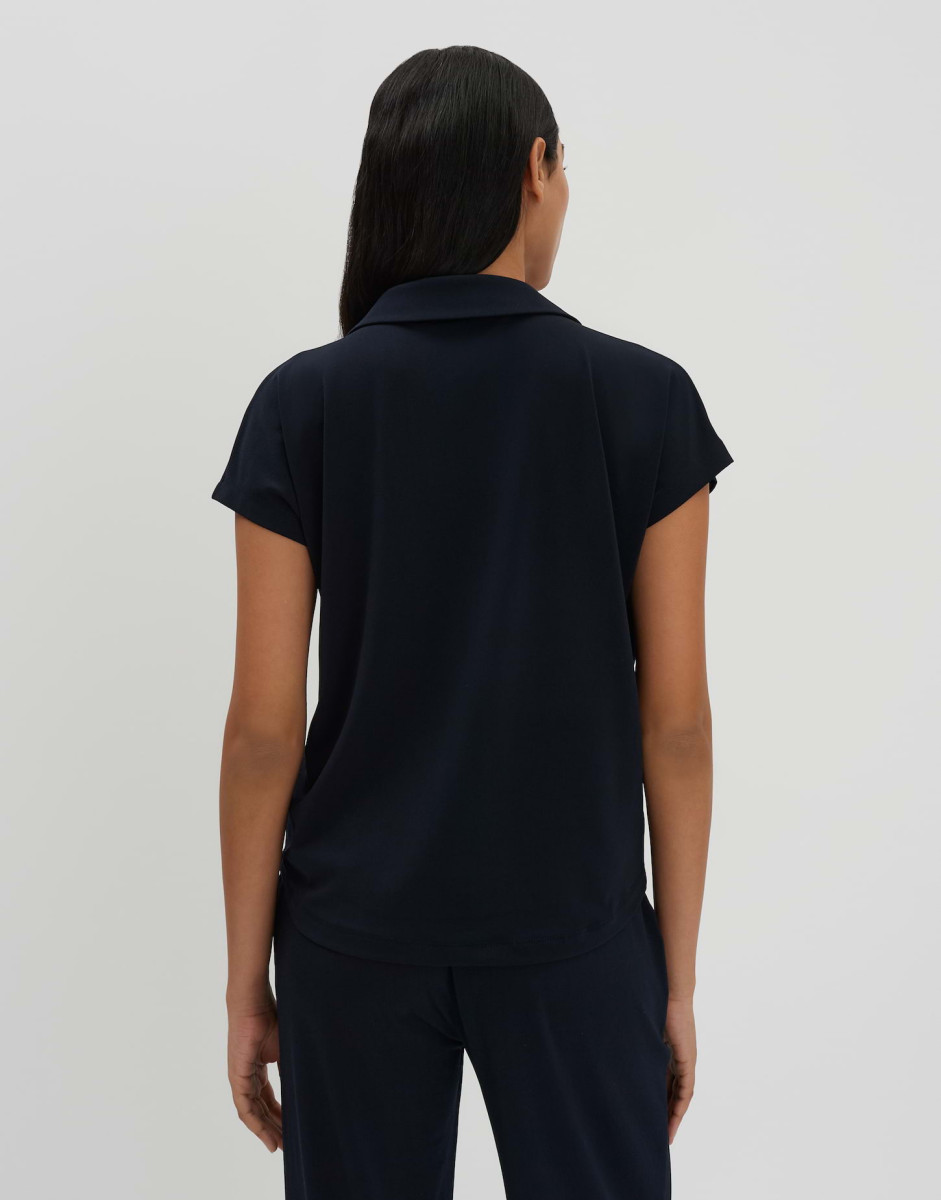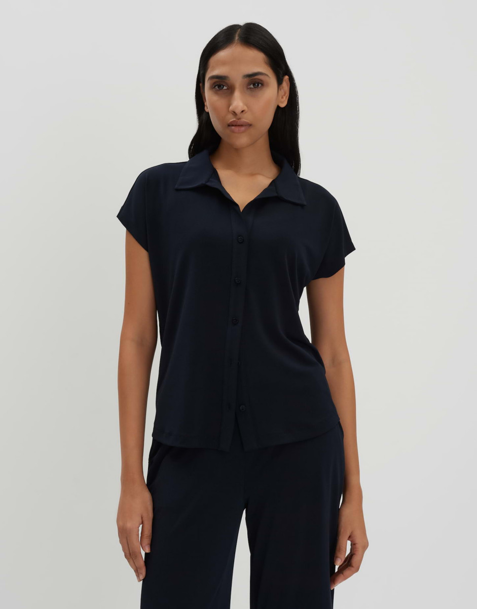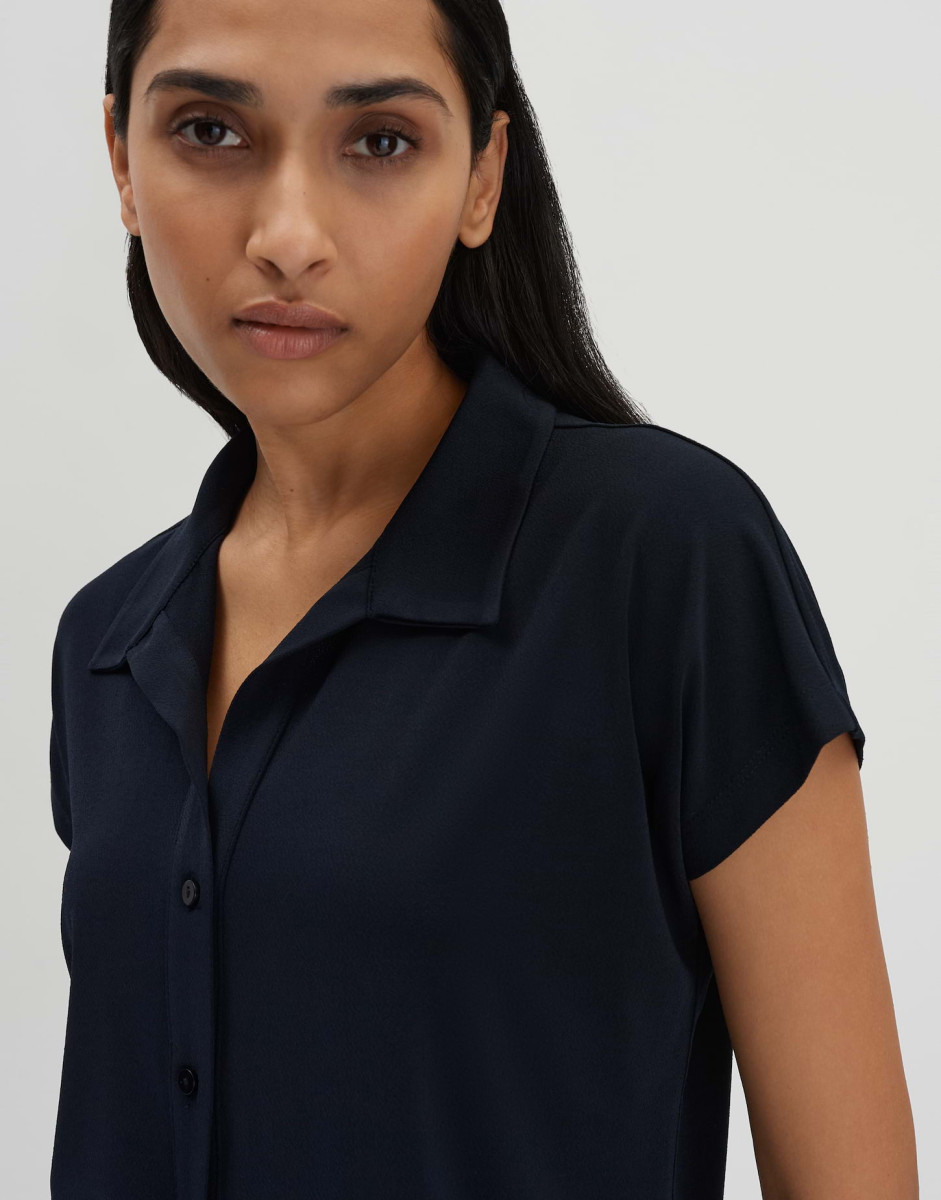 Lockere Passform | Gerader Schnitt | Normale Länge | Überschnittener Kurzarm | Umlegekragen | Rückenlänge ca. 60 cm bei Größe 36 | Model Größe 176 cm – trägt Größe 36 | Jersey | Gekreppte Oberfläche | Leichter Stoff | Knitterarm | Weich fließender Fall | Abgerundeter Saum | Knopfleiste