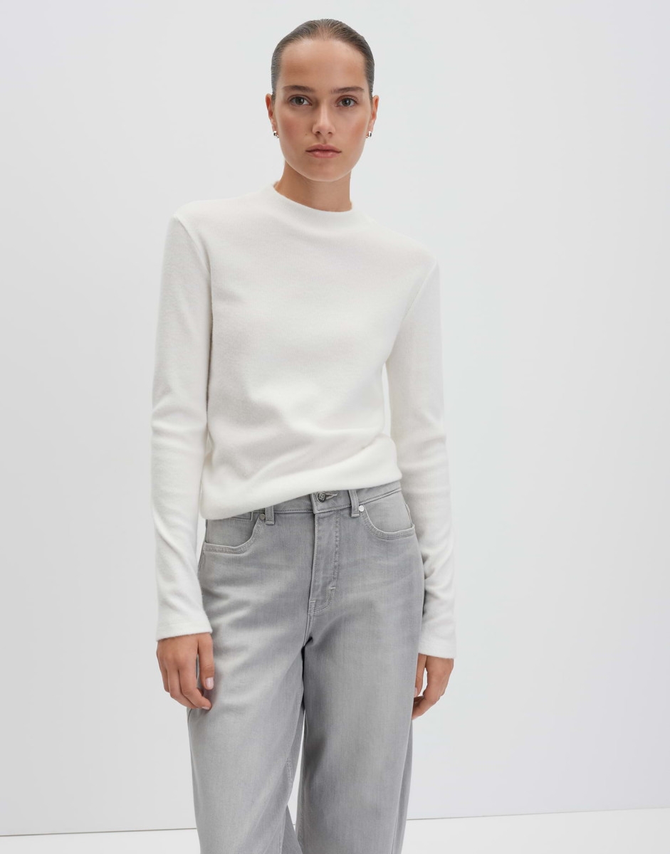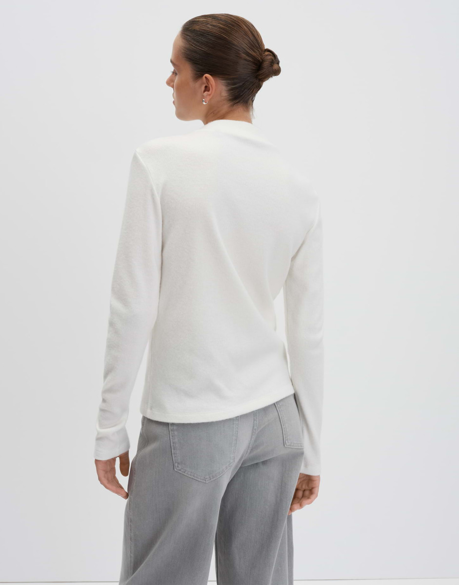 Minimalistisch, stilvoll und zeitlos: Dieses weiße Longsleeve mit Stehkragen ist ein echtes Must-have für jede Garderobe. Der weiche, hochwertige Stoff sorgt für angenehmen Tragekomfort, während der schlichte Schnitt maximale Vielseitigkeit bietet – perfekt für Layering-Looks oder als elegantes Basic für Büro und Freizeit.