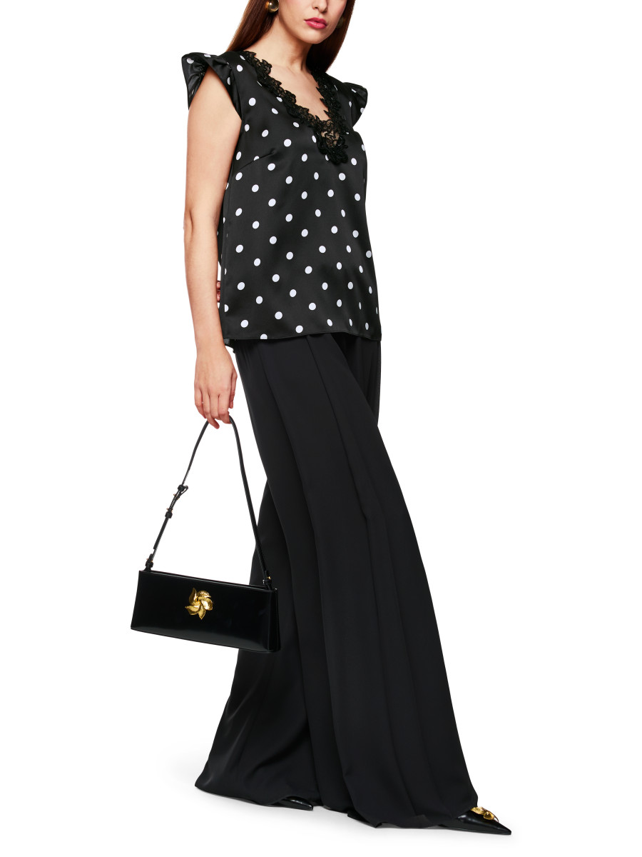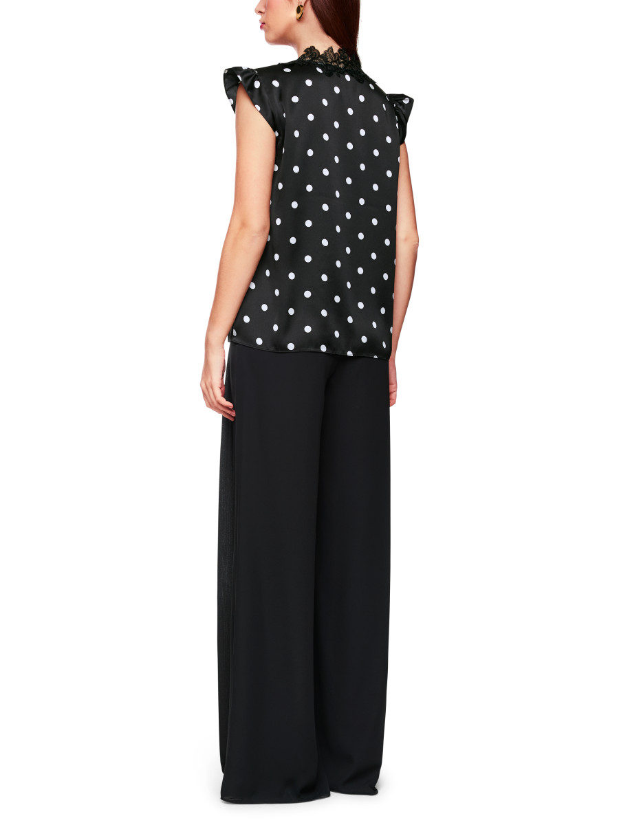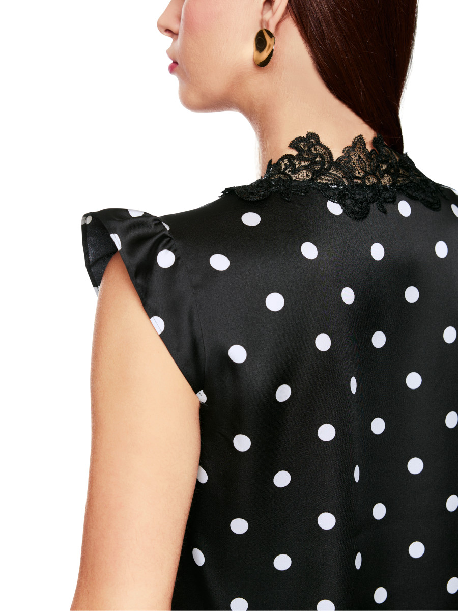 Top mit Pünktchen "Rethink Together"| Feminin präsentiert sich das Top mit Pünktchen-Print aus fließendem Material. Kleine Volants an der Schulter wirken verspielt. Ein Blickfang ist auch der Spitzenbesatz mit Mini-Pailletten, der über den kompletten Ausschnitt verarbeitet wurde. Das Top trägt das Nachhaltigkeitslabel "Rethink Together". Gerader Schnitt | Fließendes aterial | V-Ausschnitt | Im Pünktchen-Design | Das Model ist 179 cm groß und trägt N3/38.