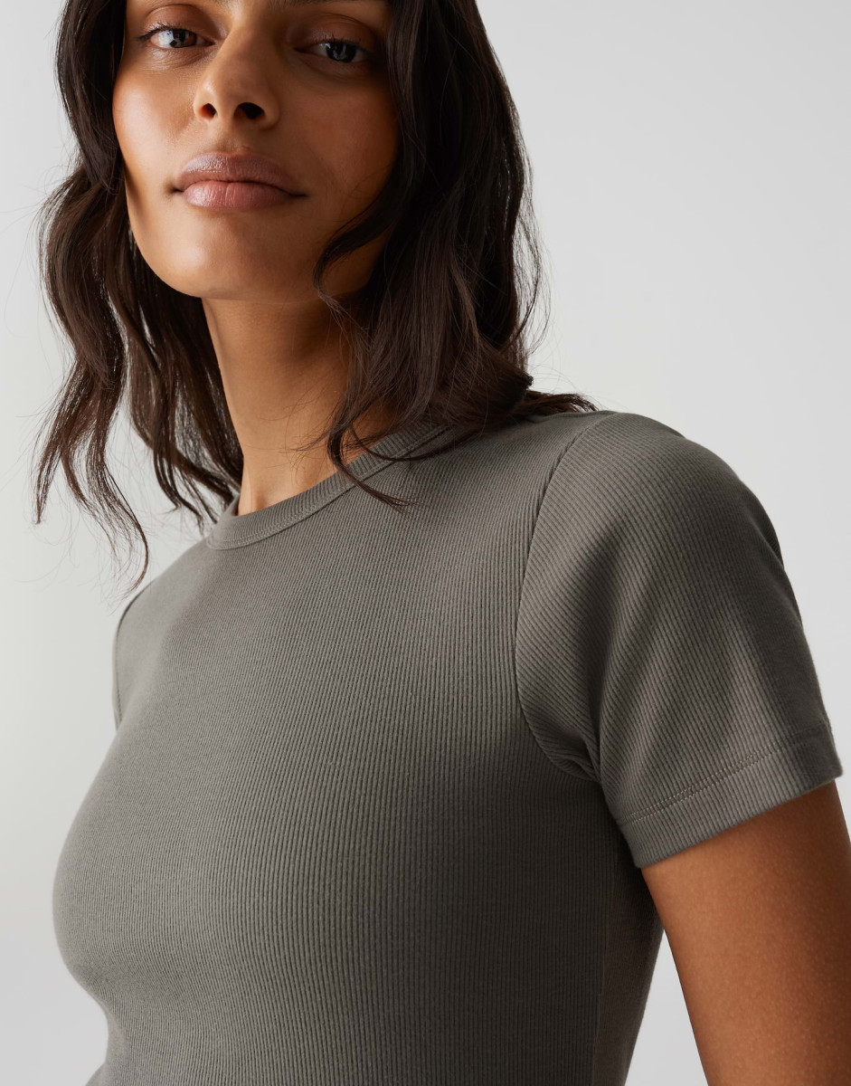 Schmale Passform | Kurzarm | Rundhalsausschnitt | Rückenlänge ca. 58 cm bei Größe 36 | Model Größe 179 cm – trägt Größe 36 | BCI Cotton-Mix | Jersey | Rippstruktur | Elastischer Stoff