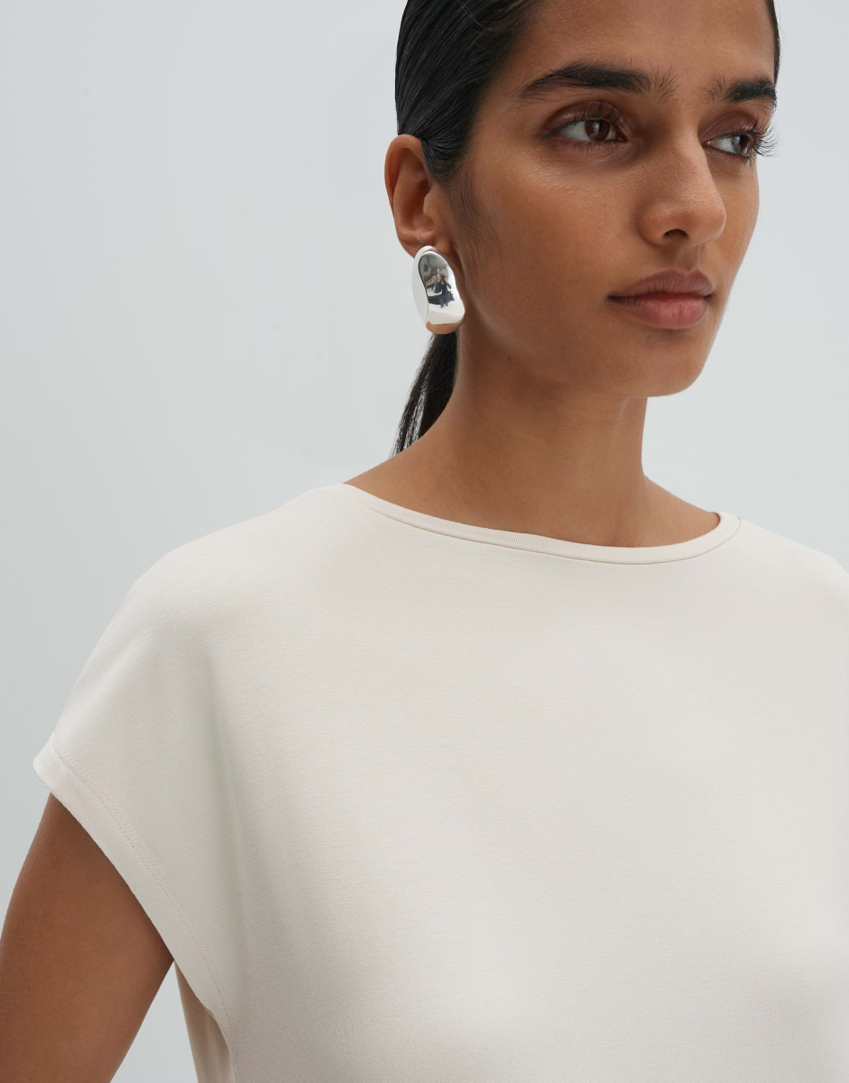 Lockere Passform, gerader Schnitt | Normale Länge | Überschnittener Kurzarm | U-Boot-Ausschnitt | Jersey | Weicher Griff | Elastischer Stoff | Schlitz im Rücken