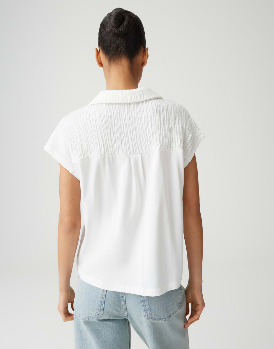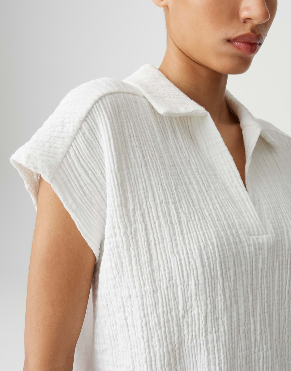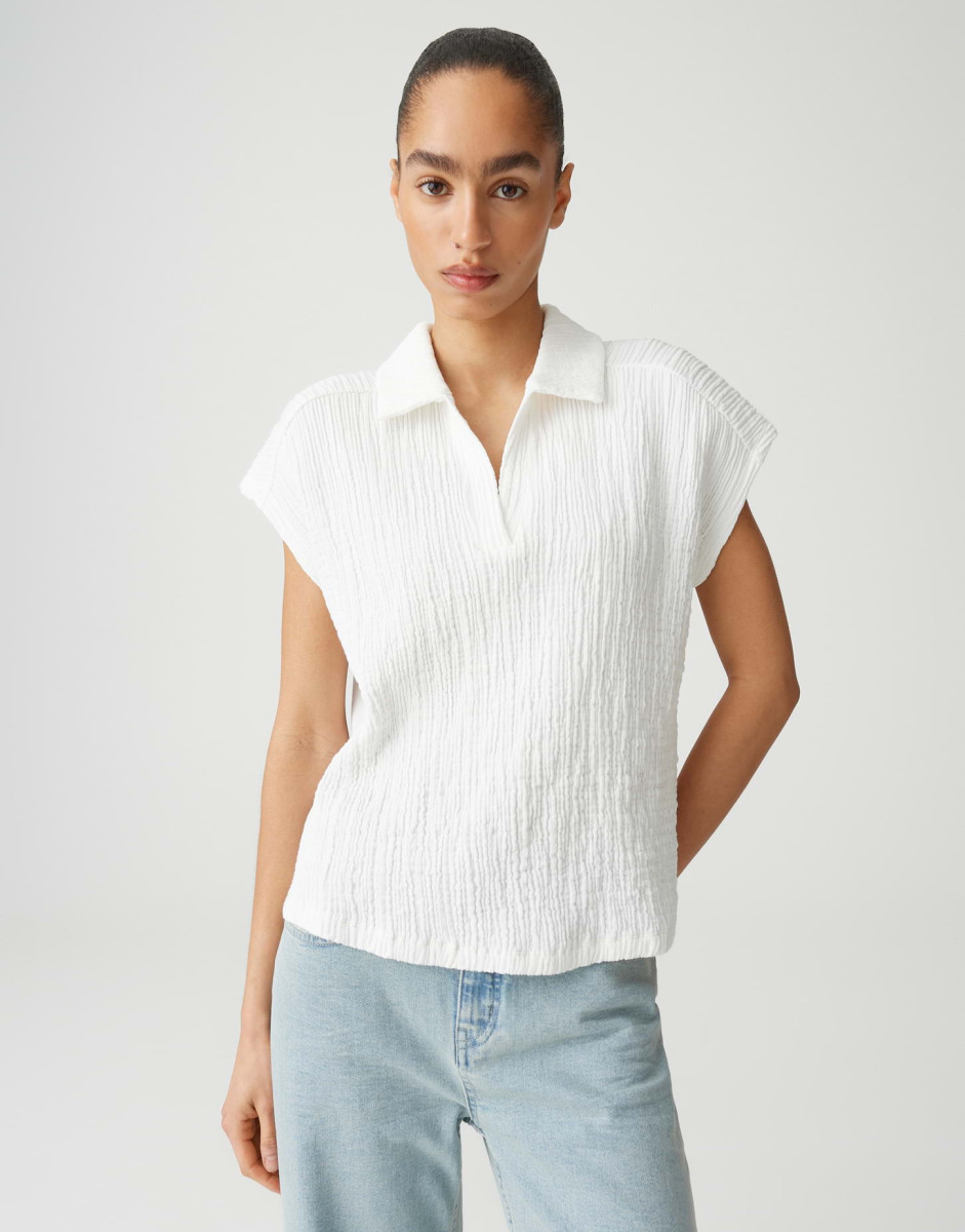 Das Top hat eine lockere Passform mit geradem Schnitt, überschnittenen kurzen Ärmeln sowie einem V‑Ausschnitt und Polokragen. Der Rücken ist mit Jersey gearbeitet und verfügt über eine Passe mit Quetschfalte, die für einen dezenten Crinkle‑Effekt sorgt. Der weiche Griff und die leichte Transparenz machen das Teil zu einem vielseitigen Begleiter für warme Tage.Lief.-Art-Nr: 10553012176106
