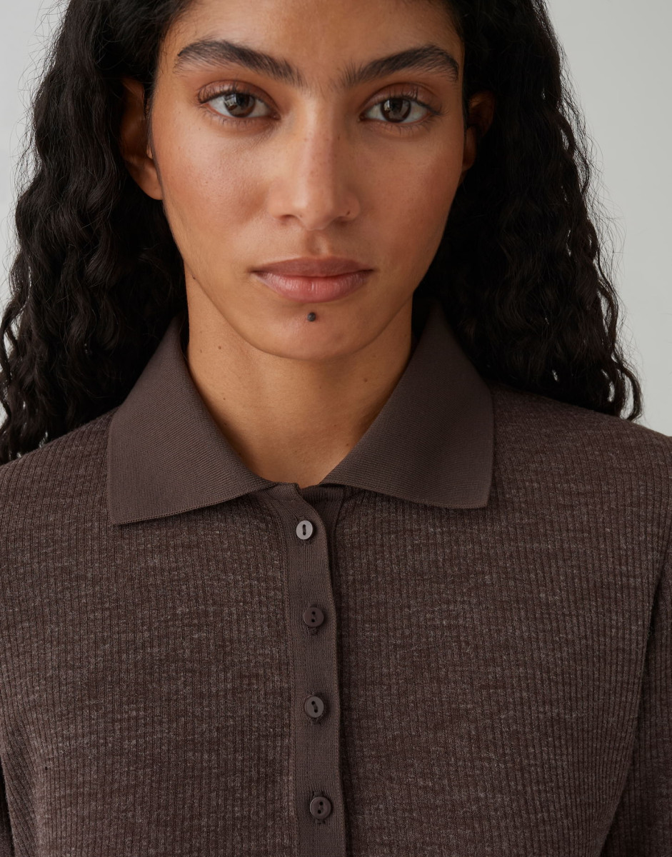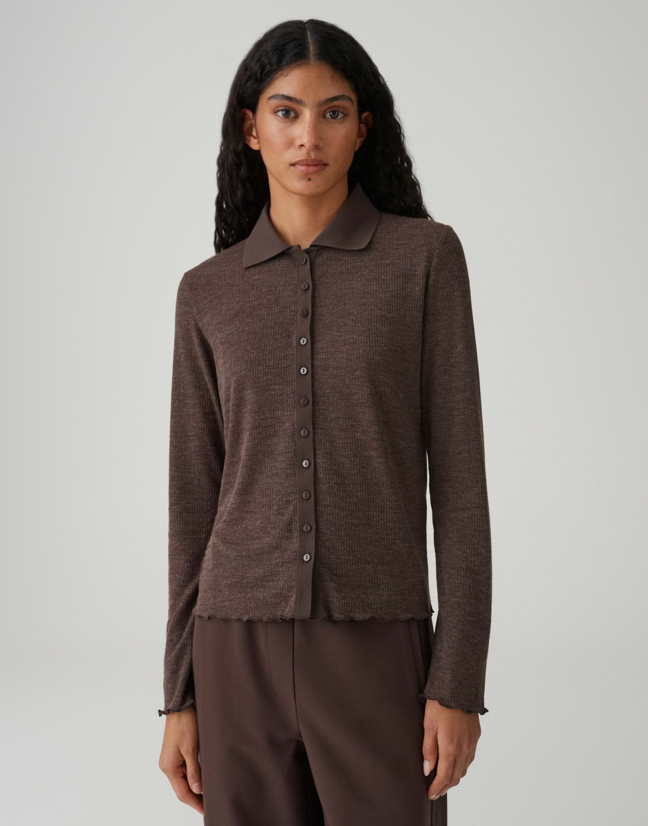 Das figurbetonte Top Sosea überzeugt mit schmaler Passform und einem eleganten Umlegekragen, der dem Oberteil eine klare Silhouette verleiht. Das langärmelige Jersey-Top verfügt über eine feine Rippstruktur, einen weichen Griff und elastische Eigenschaften; die wellige Kante am Saum und die dezente Knopfleiste setzen modische Akzente.