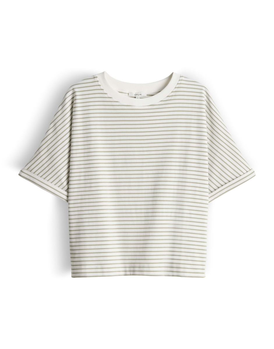 Das Top Sotel besticht durch seine weite Boxy-Fit-Passform und einen klassischen Rundhalsausschnitt, der für einen lässigen Look sorgt. Das kurzärmelige Shirt zeigt ein dezentes Streifenmuster und ist mit seitlichen Schlitzen gearbeitet. Mit glattem Griff und leichter Elastizität bietet es hohen Tragekomfort.
