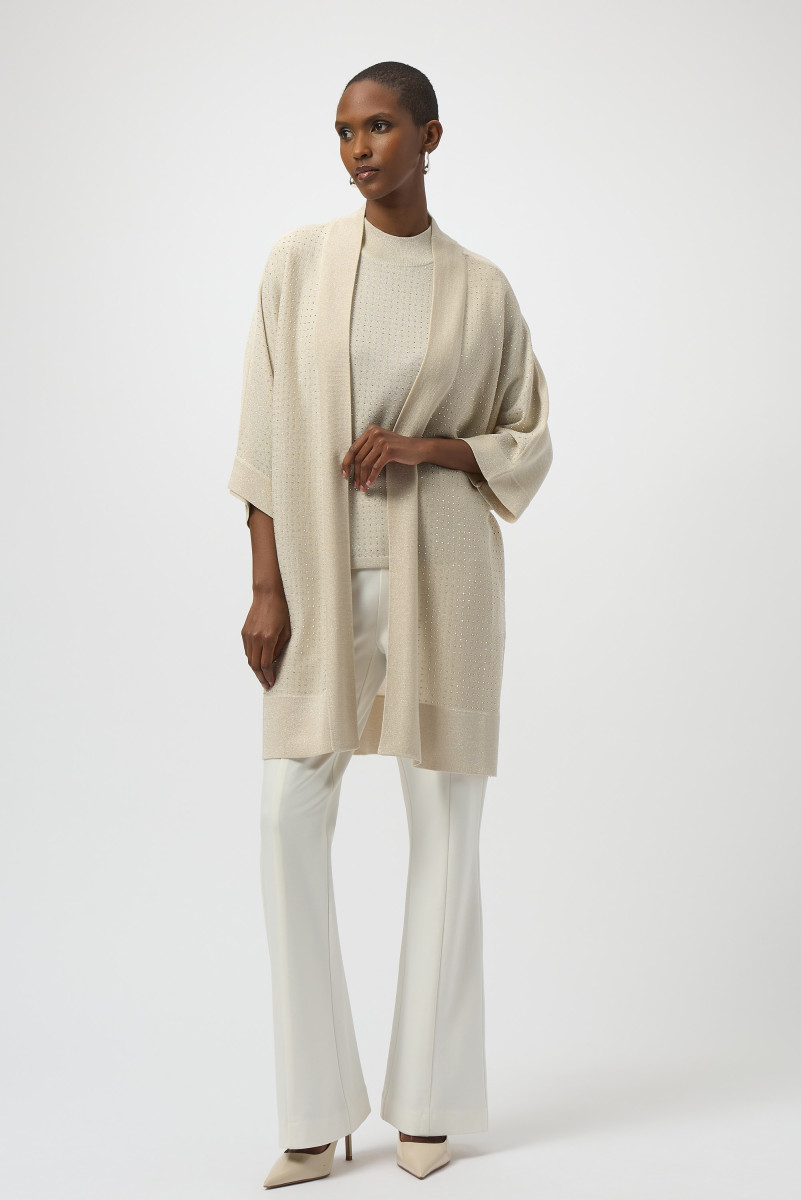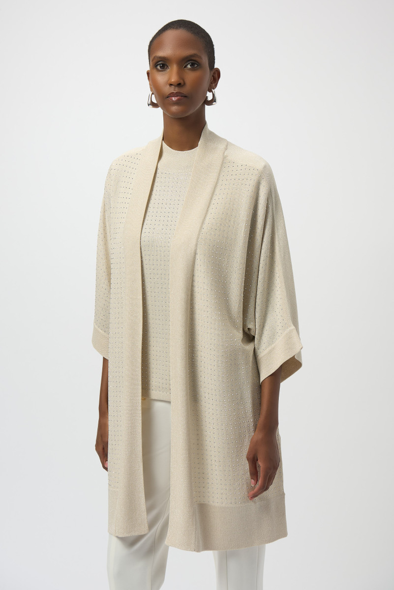 Diese elegante Jacke aus weichem Strick erhält durch die schimmernden aufgebügelten Details auf der Vorderseite einen glamourösen Touch. Das lange, vorne offene Design und die gerade Silhouette sorgen für einen anmutigen, fließenden Look, der sich für jeden erdenklichen Anlass hervorragend eignet.