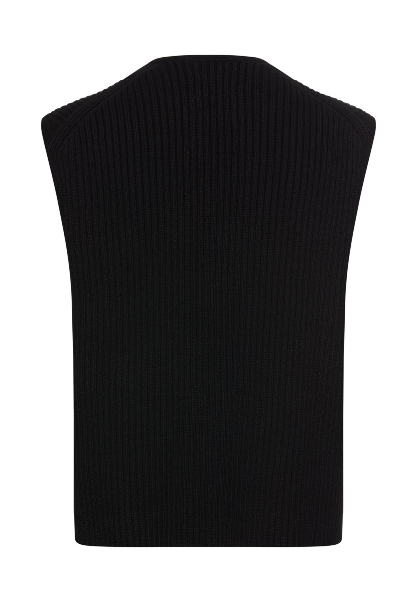 Die Strickweste überzeugt mit ihrer klaren Form und einer Rippstruktur, die für festen Griff und ein angenehmes Tragegefühl sorgt. Der Materialmix aus Baumwolle und Wolle bringt natürliche Wärme in den Look. Die aufgesetzten Pattentaschen und der verkürzte, ärmellose Schnitt machen die Weste vielseitig einsetzbar – ideal zum Layern an kühleren Tagen.