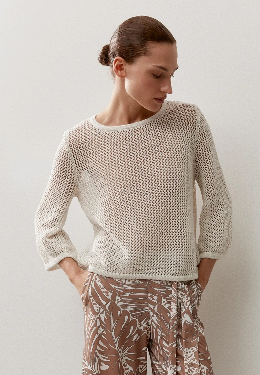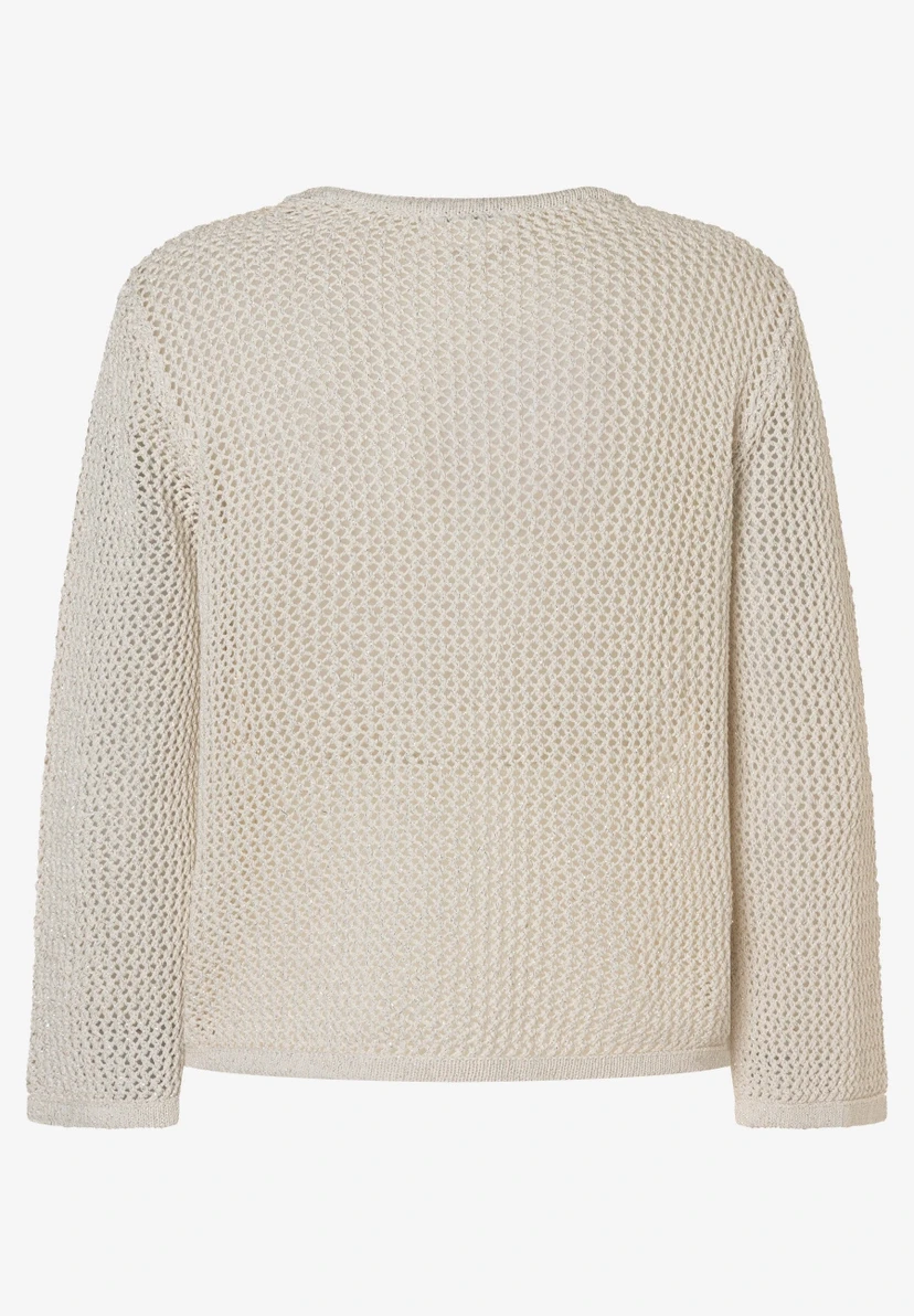 Gerade, lockere Form | Runder Ausschnitt | 3/4 lange Ärmel | Schmale Rippstrickbündchen an den Abschlüssen | Transparente Optik aufgrund Lochstrick-Muster | Luftige Baumwollmischung mit Glanzeffekt