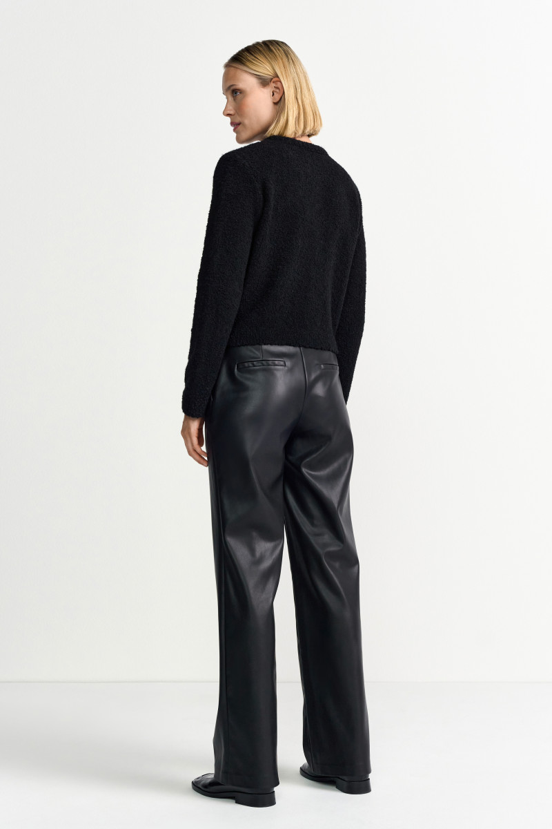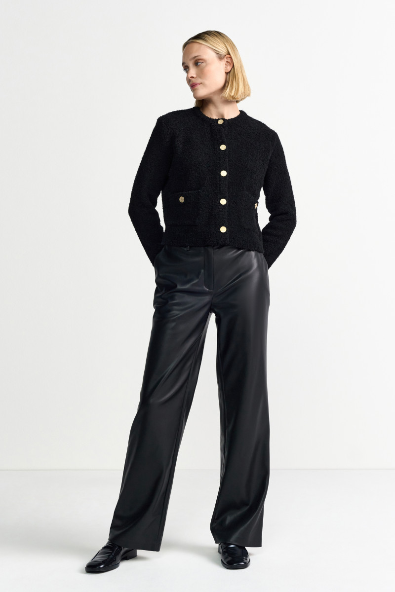 Die Jacke zeichnet sich durch sorgfältige Details aus: der klassische Rundhalsausschnitt, die durchgehende Knopfleiste mit dunklen Designer-Knöpfen und die zwei aufgesetzten Brust- oder Eingrifftaschen mit Knopf-Akzenten unterstreichen den edlen, französischen Chic. Die monochrome Farbgebung in Schwarz macht die Jacke extrem vielseitig kombinierbar.