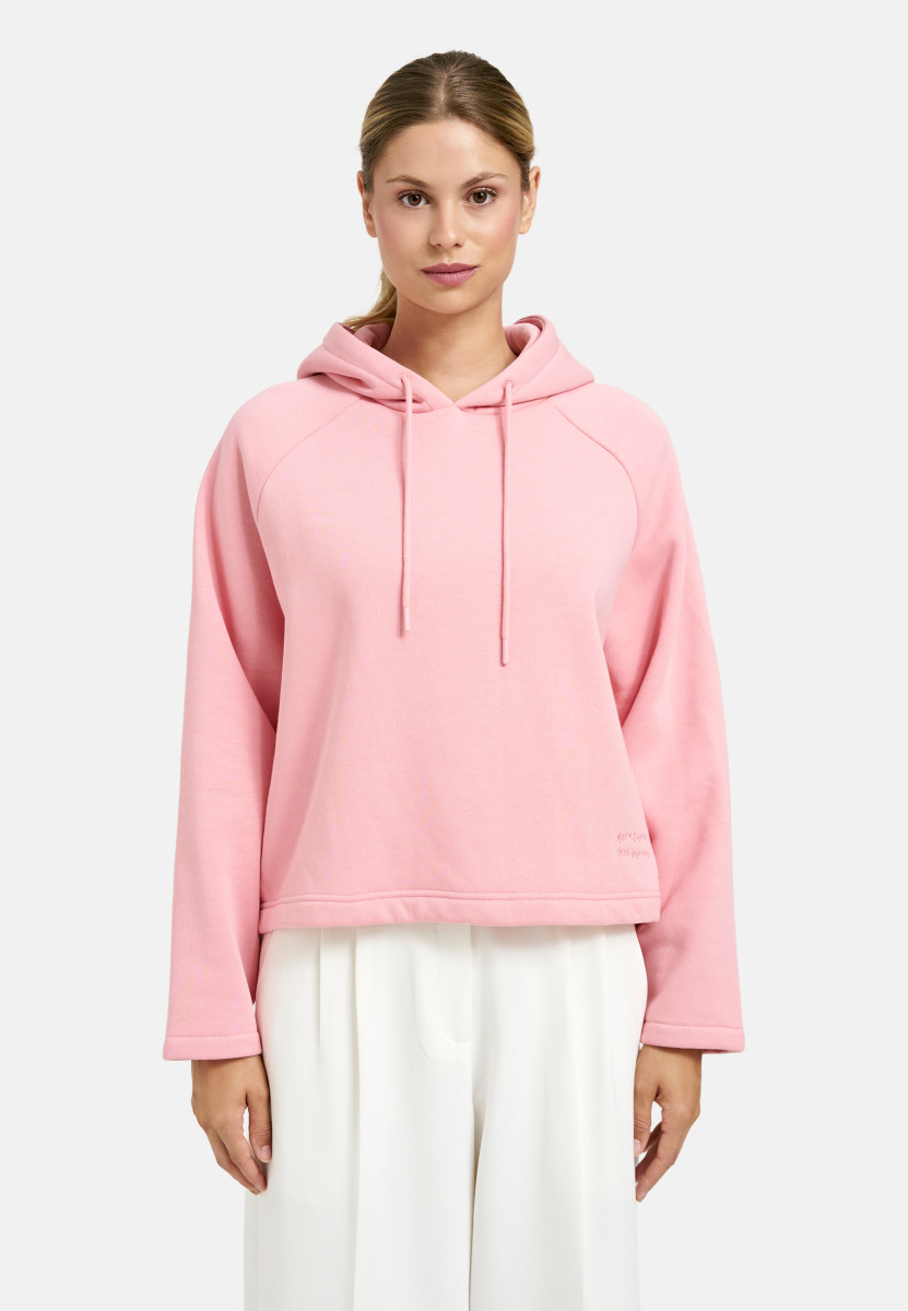 Gefertigt aus weichem Sweatstoff, der innen angenehm angeraut ist, bietet dieser Hoodie ein besonders gemütliches Gefühl. Charakteristisch für das Design sind die Raglanärmel, die eine entspannte Schulterpartie kreieren, sowie die großzügige Kapuze mit Ton-in-Ton-Kordelzug, die Schutz und einen sportlichen Touch bietet.