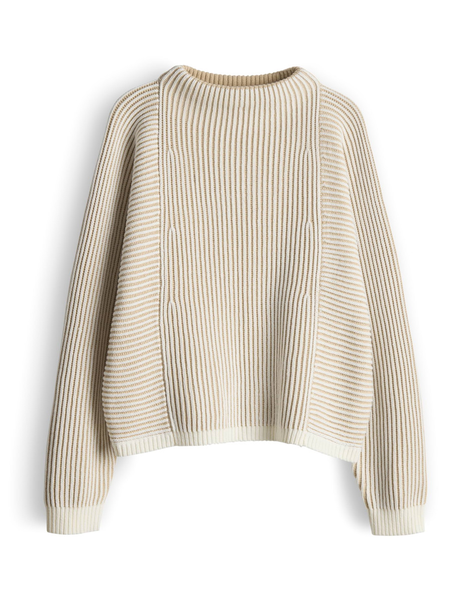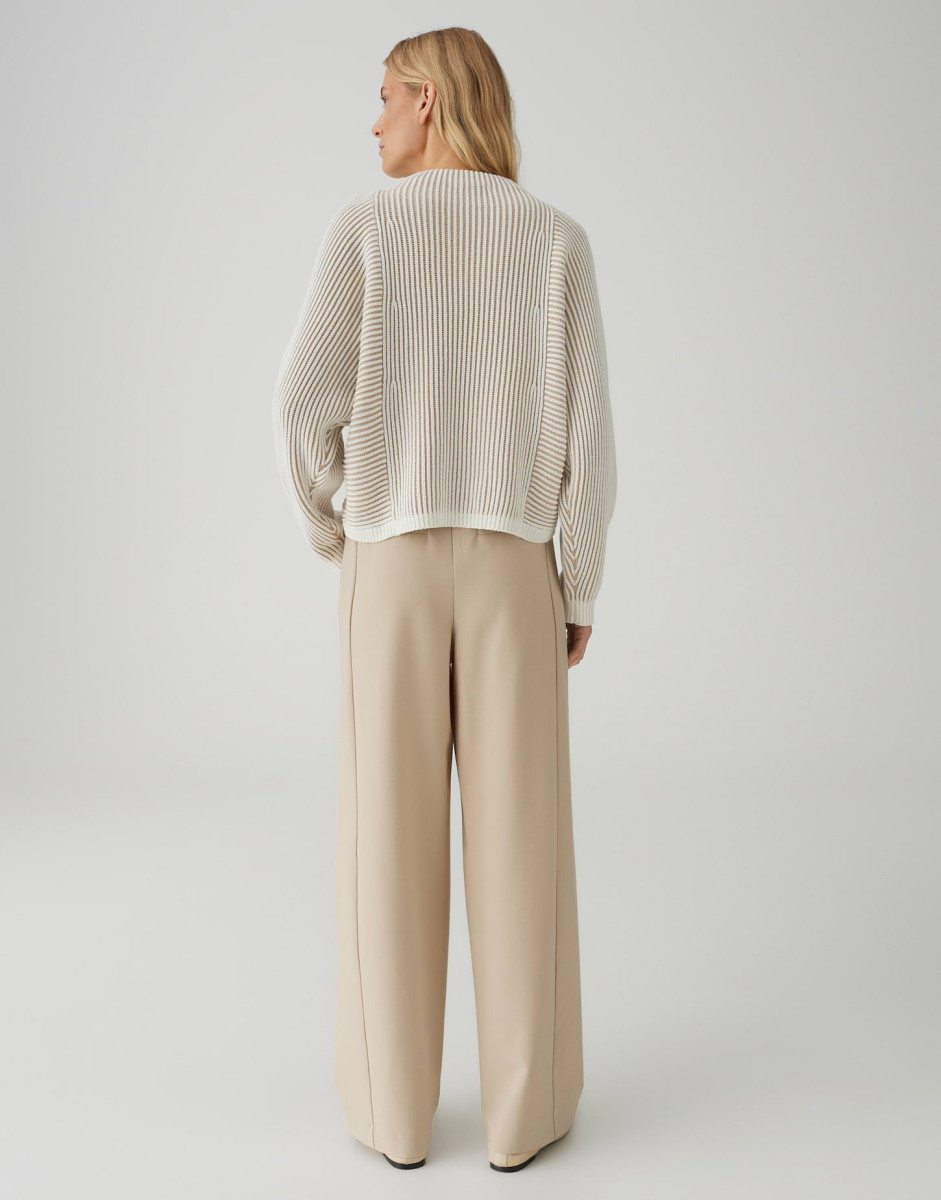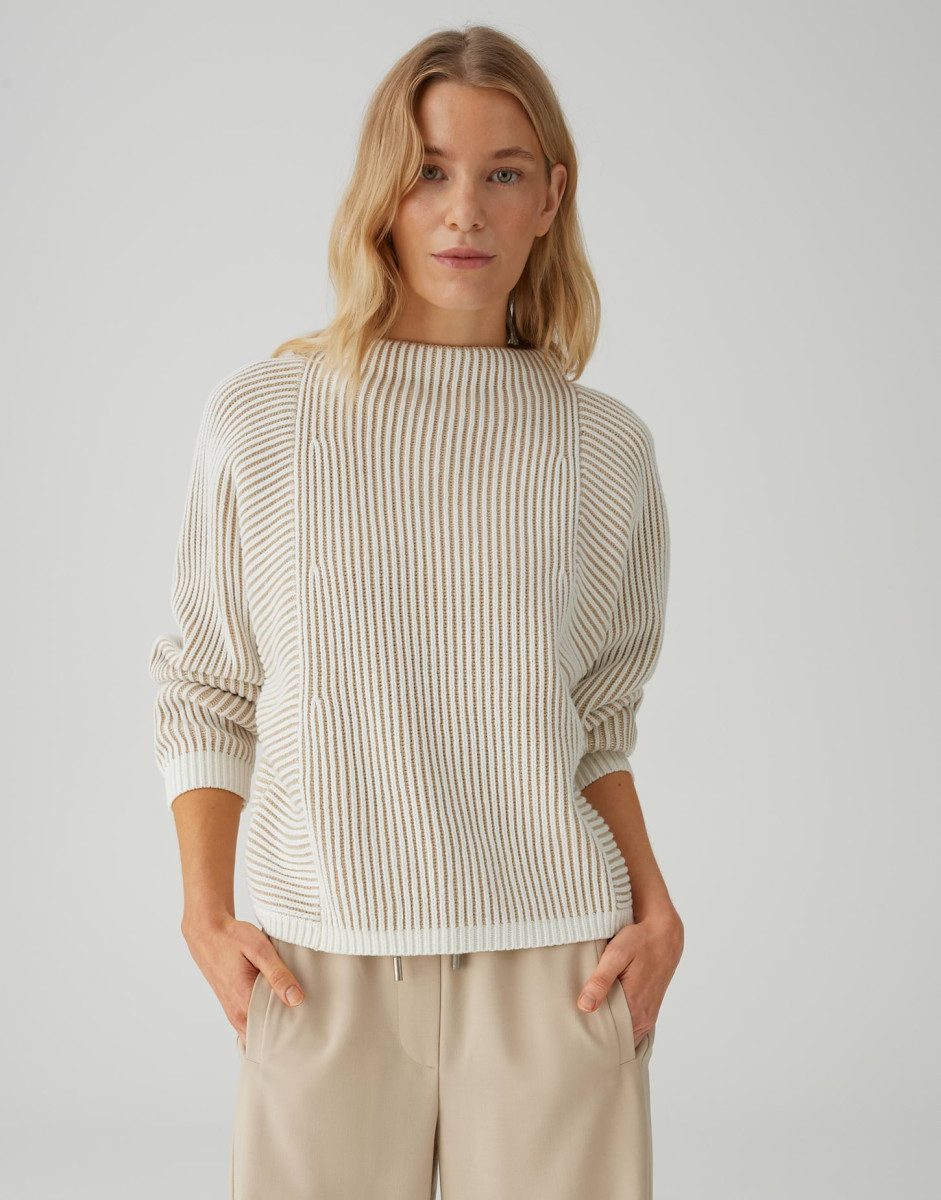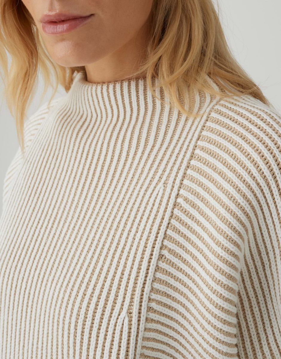 Dieses hochwertige Strickteil überzeugt durch eine moderne, lockere Passform mit schmal zulaufendem Schnitt und einem leicht verkürzten Design, das aktuelle Trends stilvoll aufgreift. Der lange Fledermausärmel sorgt für eine entspannte Silhouette und bietet gleichzeitig hohen Tragekomfort. Mit einer Rückenlänge von ca. 53 cm bei Größe 36 ist das Modell ideal proportioniert und lässt sich vielseitig kombinieren. Die feine Rippstruktur verleiht dem Strick eine besondere Optik und unterstreicht den weichen Griff, der sich angenehm auf der Haut anfühlt. Dank der wärmenden Eigenschaften eignet sich das Strickdesign perfekt für kühlere Tage. Ein zweifarbiges Muster sowie farblich abgesetzte Strickbündchen setzen modische Akzente und machen das Kleidungsstück zu einem stilvollen Begleiter für Alltag und Freizeit.