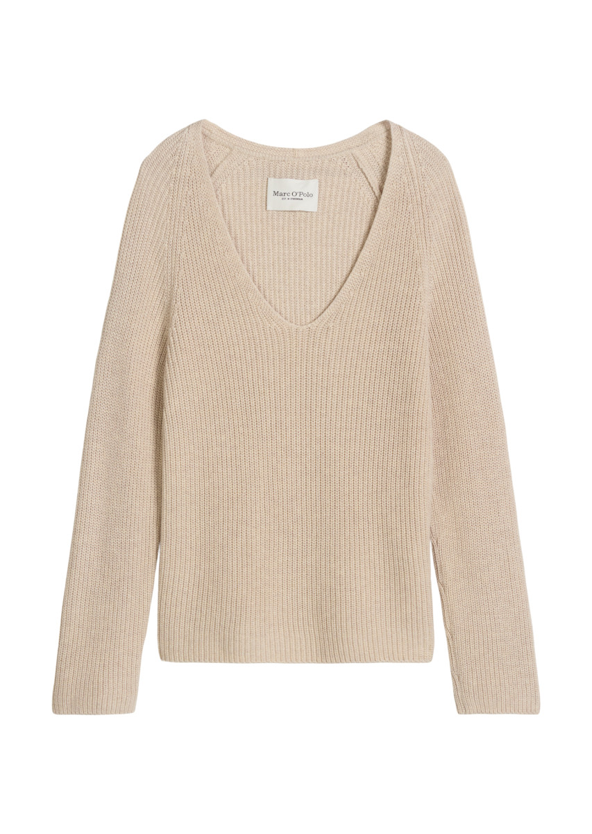 Marc O'Polo Damen Pullover moderner Klassiker aus exklusivem Organic Cotton-Garn lässiger Strickpullover mit zeitlosem Patent-Muster lockerer Regular Fit mit V-Ausschnitt sportiver Raglanärmeln Blickfang-Detail: der aufwendige Musterstrick am Ellenbogen-Bereich