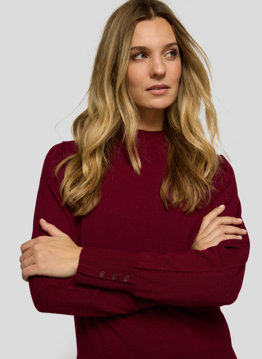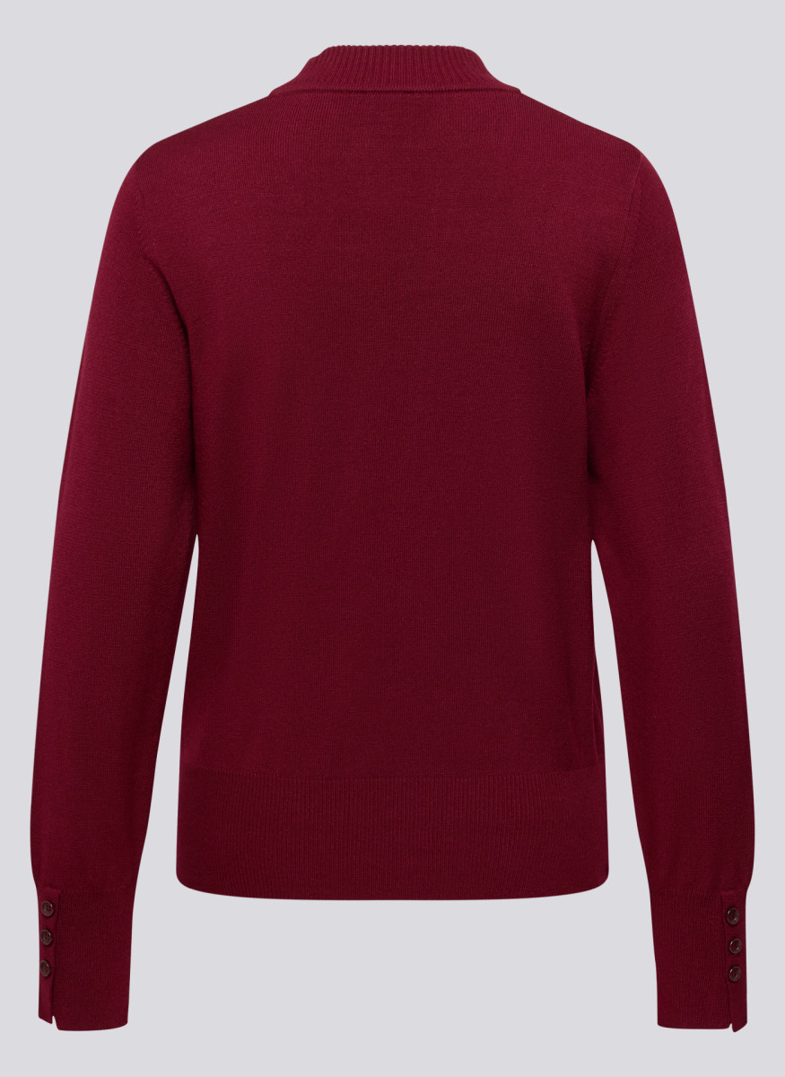 Der Pullover überzeugt mit seiner feinen Strickstruktur und dem klassischen Stehbund. Die langen Ärmel enden in breiten Rippbündchen, die mit drei kleinen Knöpfen stilvoll akzentuiert sind. Seitliche Schlitze am Saum sorgen für einen angenehmen Sitz. Der weiche Materialmix mit Modal-Anteil trägt sich besonders komfortabel.