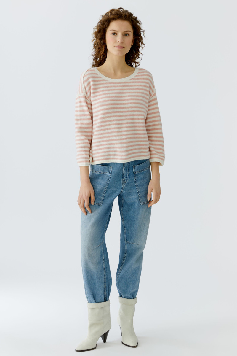Weiche, flauschige, elastische Garnmischung in Streifen gestrickt | Lässig geschnitten, reguläre Länge | Großzügiger Rundhals mit Strickbündchen | Überschnittene Schulter, fällt locker zum 3/4 Arm | Ärmelbündchen und Saum sind gerade, mit Rollkante
